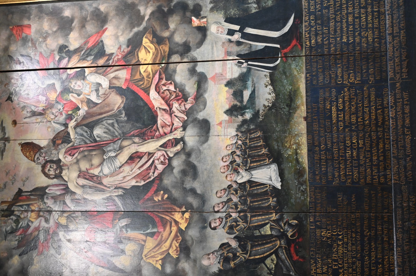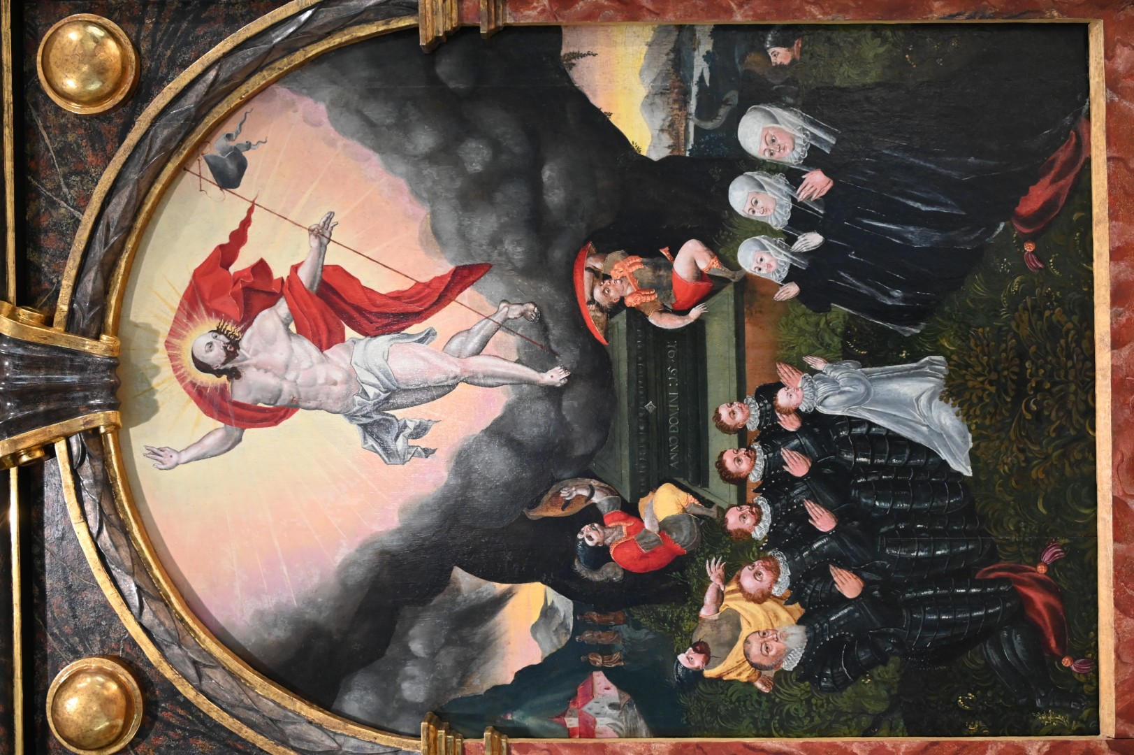 Następnie weszliśmy w krąg śmierci (wystawa: Luterańskie epitafia i portrety upamiętniające) i dłuższą chwilę spędziliśmy przed prawdopodobnie najcenniejszym eksponatem w kolekcji Muzeum Prus Górnych. Mowa o późnorenesansowym, namalowanym na desce sosnowej, epitafium wspomnianego Piotra zu Dohny i jego małżonki – Katarzyny z Czemów (von Zehmen). Obraz ten powstał w co najmniej dwóch fazach i wyszedł, jak się przypuszcza, spod pędzla Hansa Hennebergera z Królewca, syna słynnego uczonego i kartografa. Początkowo przedstawiał tylko Piotra i Katarzynę (ok. 1550 roku), później – ok. 1600 roku – został uzupełniony do sceny wielopostaciowej z ich ośmioma synami i córką oraz wzbogacony kompozycją zaczerpniętą z grafiki Albrechta Dürera z 1511 roku – sceną Trójcy Świętej. Którą to scenę zamalowano w 1624 roku, a ukazała się dopiero po renowacji w Słobitach.