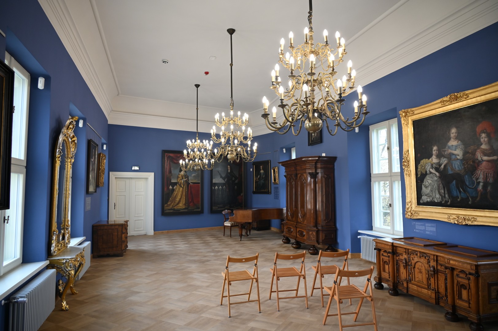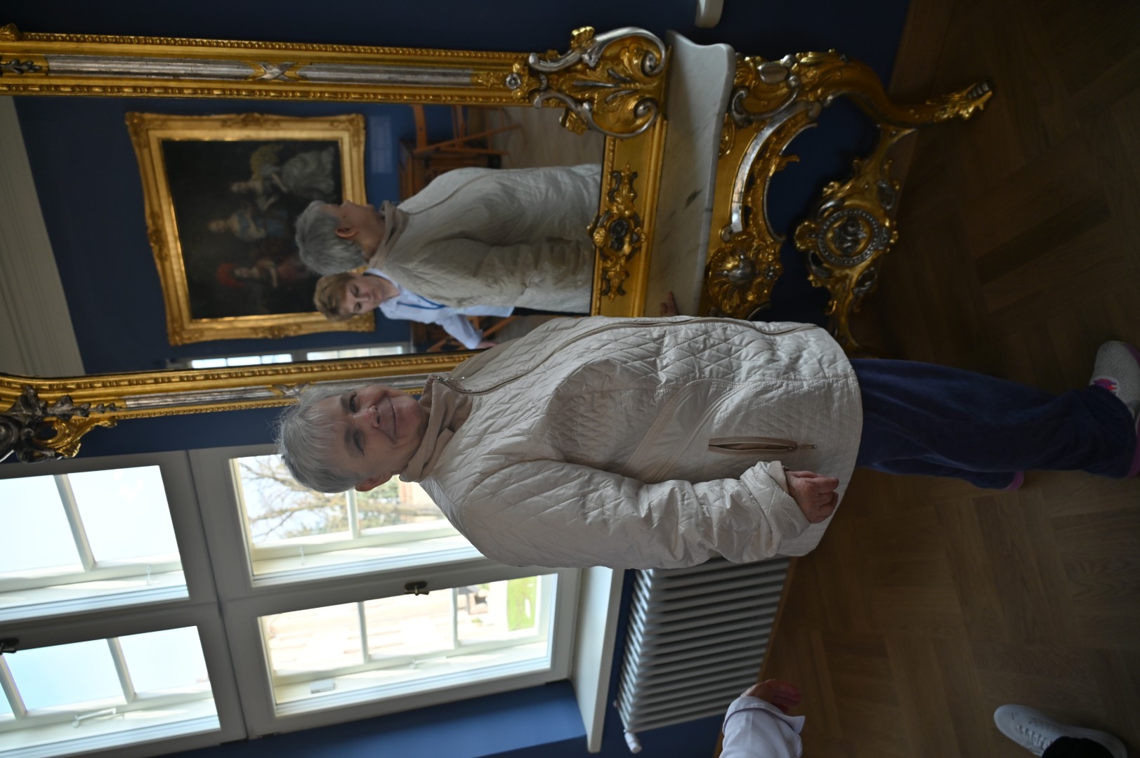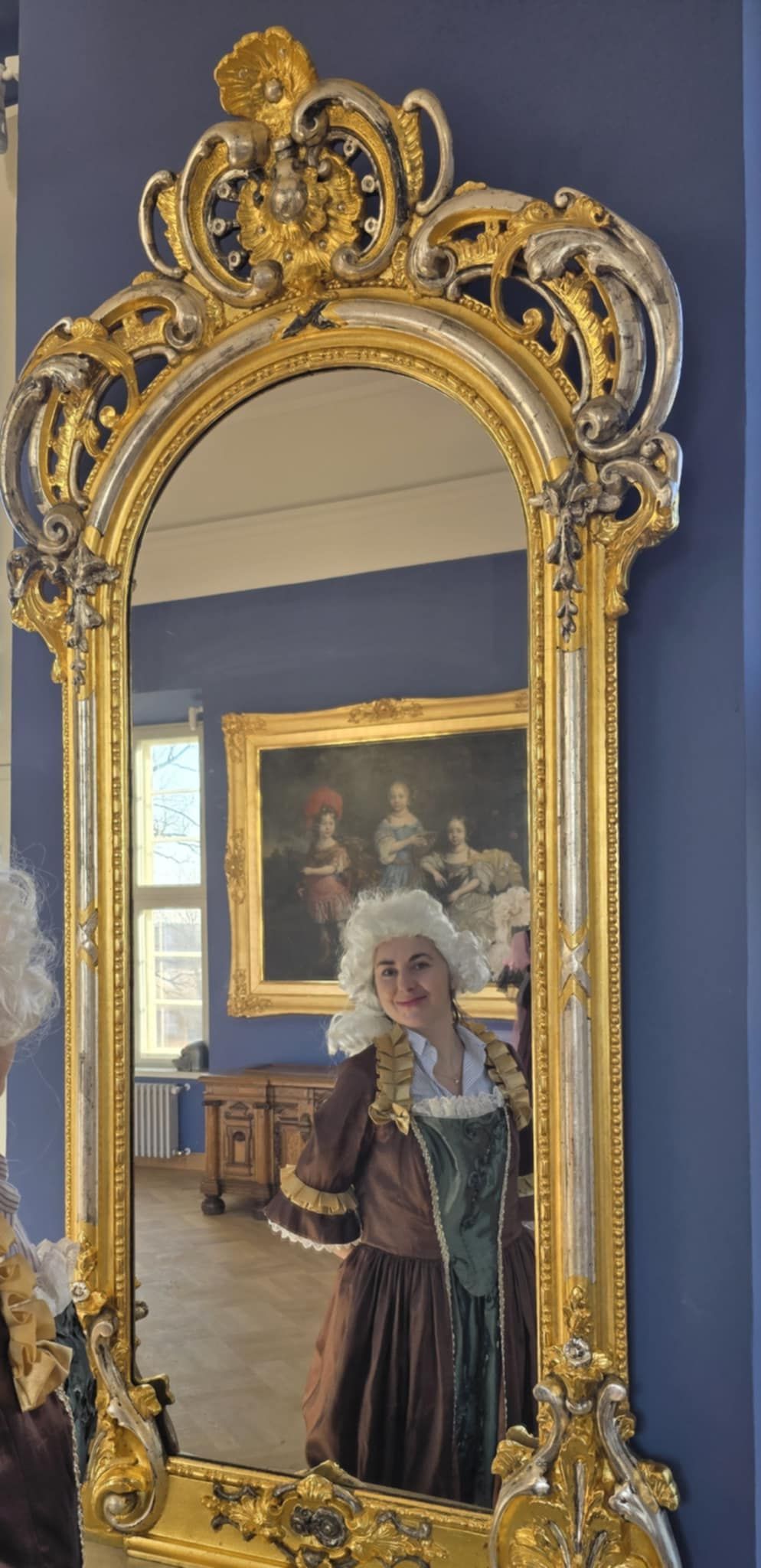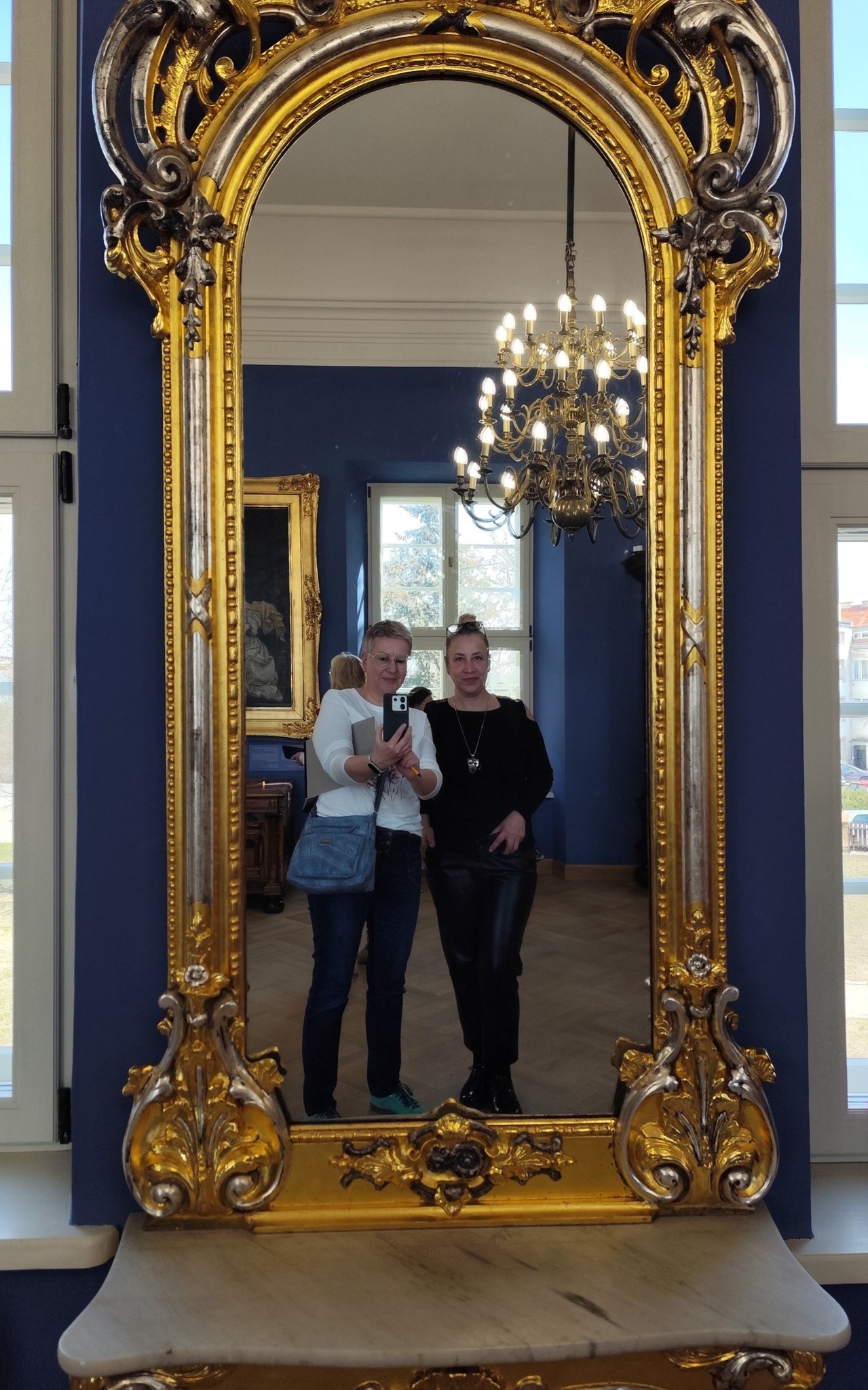 Kiedy już napatrzeliśmy się na niezliczone meble, zastawy, żyrandole i obrazy (dużo, dużo naprawdę świetnych płócien) dotarliśmy wyczerpani do błękitnej sali zatytułowanej „Dynastia Orańska oraz jej powiązania z rodem zu Dohna”. Co się w niej znajduje nie byliśmy już w stanie zrozumieć, ale naszą uwagę przykuło złote lustro. Otóż ma ono ma taką właściwość, że kto się w nim odbije, przechodzi – jak Alicja z książki Lewisa Carrolla – na drugą stronę i pozostaje tam, poszukując, ruchem szachowego pionka, insygniów związanych z panowaniem dawnych rodów oberlandzkich. My dostrzegliśmy po drugiej stronie lustra nie tylko siebie, ale również osoby, które poznaliśmy w zeszłym roku, a które też przed nami odwiedziły już Muzeum Prus Górnych (jak np. Pani Magda ze Śliwicy czy Pani Małgorzata z Jachtklubu elbląskiego). Może jest to zatem tajemnicze, magiczne lustro, mówiące do nas: