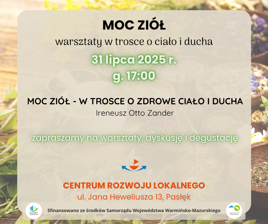 Już 31 lipca o godz. 17:00 do Centrum Rozwoju Lokalnego w Pasłęku (ul. J. Heweliusza 13) porozmawiamy o... MOCY ZIÓŁ w trosce o ciało i ducha - w programie przewidziane zostały warsztaty zielarskie, poczęstunek kawowy i oczywiście dyskusja.