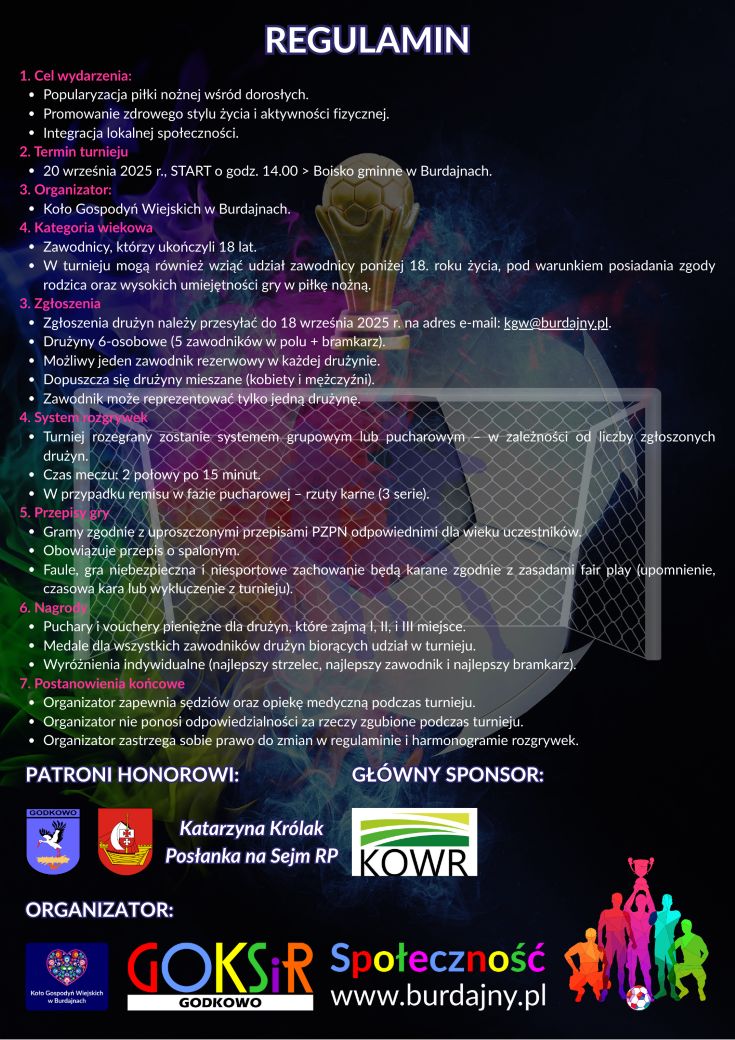 Podczas wydarzenia prowadzona będzie zbiórka na modernizację boiska w Burdajnach. Każdy może dołożyć swoją cegiełkę, aby wspólnie stworzyć jeszcze lepsze warunki do uprawiania sportu dla dzieci.