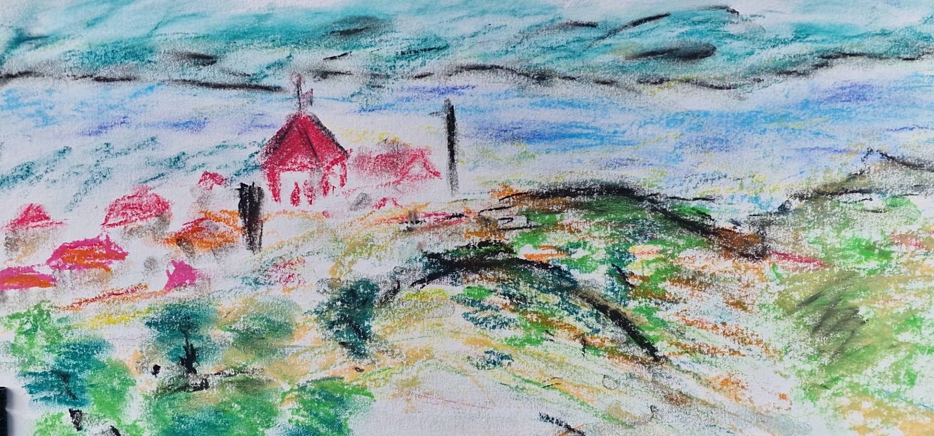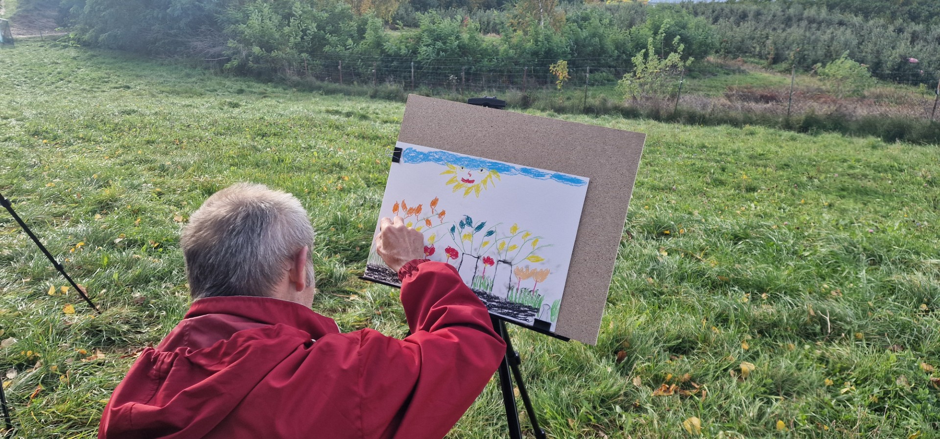Postanowiliśmy zatrzymać te chwile, utrwalić je, więc zasiedliśmy przed sztalugami. Pastelowymi kredkami przenosiliśmy na białe kartki magię rozpościerającego się przed nami teatru natury. My, niewprawni i nieutalentowani, rysowaliśmy bez ładu i składu, ale oddawaliśmy się temu zajęciu z całym sercem. Nasze ręce nie potrafiły właściwie oddać kształtów, którymi nasyciły się oczy, ale z prostotą ilustrowaliśmy nasze wyobrażenia i imaginacje. I tak oto Teresa, najpierw narysowała duży i jasny dom, zapewne tkwiący w jej marzeniach, a potem „zobaczyła” w odległym pejzażu oczekiwane z niecierpliwością wydarzenie – choinkę i św. Mikołaja. Tak, twórcza inwencja nie zna granic i wybiega daleko poza świat rzeczy widzialnych.