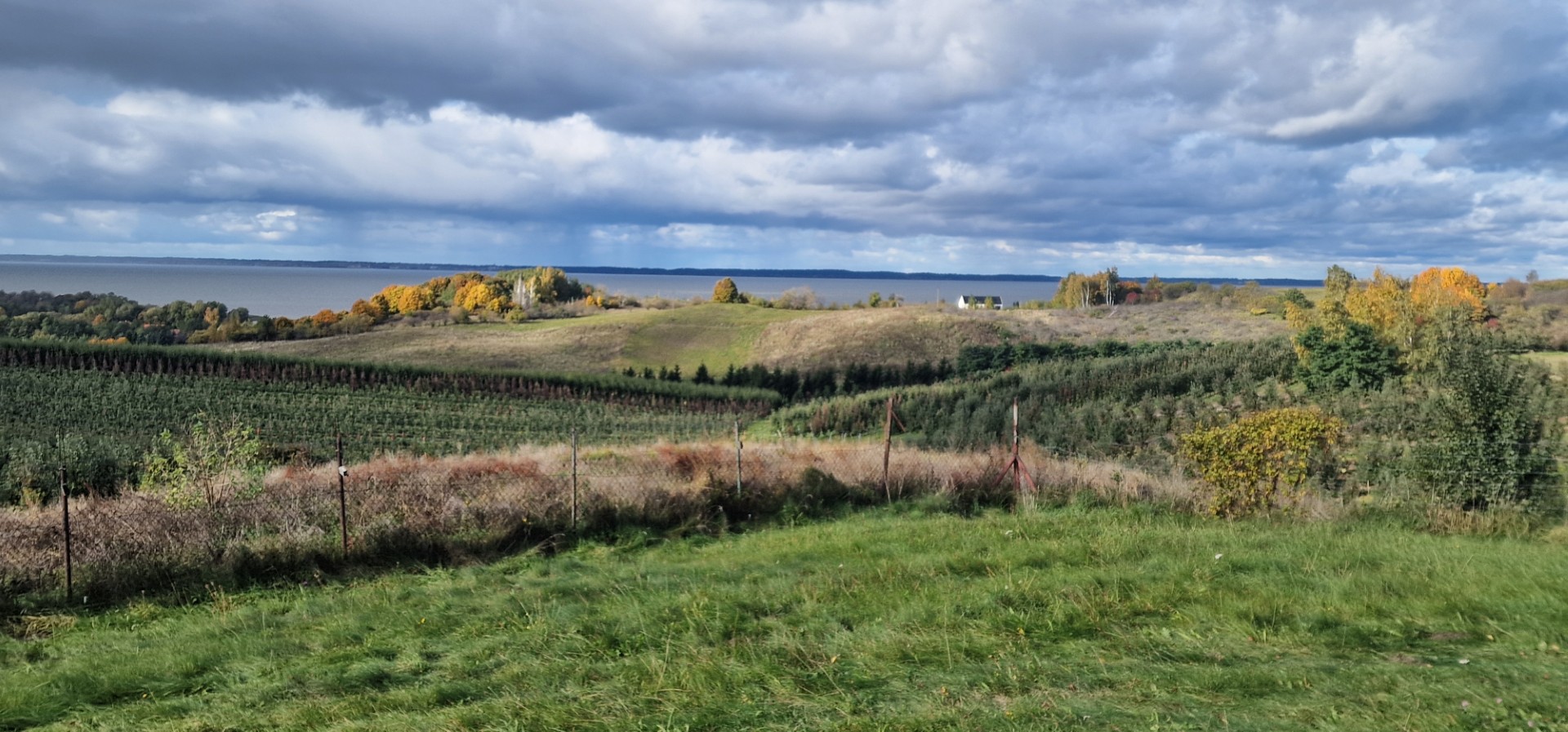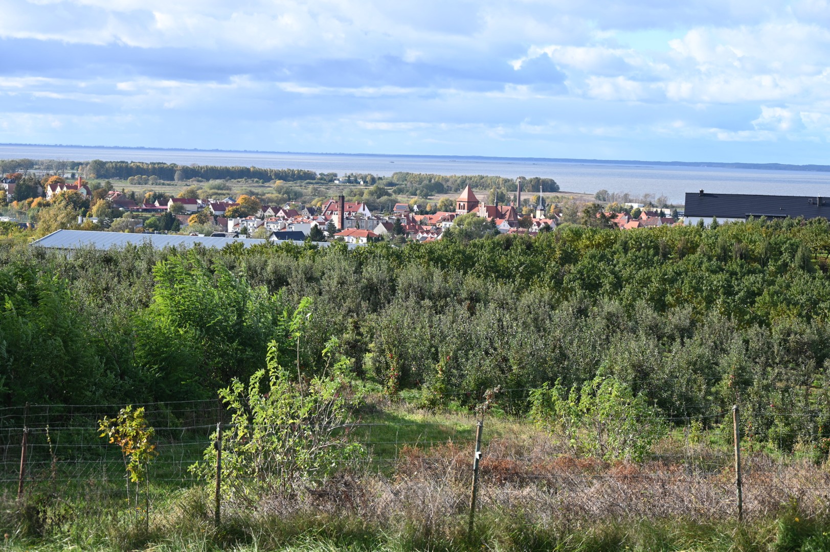 Następnie, wespół ze strudzonymi wędrowcami, pod kierunkiem Zbigniewa Zagrodzkiego oraz Pani Karoliny Galińskiej, oddaliśmy się z przyjemnością podziwianiu wspaniałych, rozległych widoków rozpościerających się – jak daleko sięgnąć – przed naszymi oczami. Cóż to są za pejzaże! - trudno słowami wyrazić ich piękno - najlepiej po prostu patrzeć i podziwiać, można tak siedzieć całymi godzinami, nic nie mówić, wyłączyć myśli, chłonąc świat rozpościerający się w szerokim spektrum, a mieniący dziesiątkami tonacji subtelnie przechodzących od jednej do drugiej. Pod nami panorama Tolkmicka, dachy domów z wyróżniającą się wieżą kościoła, czerwień dachówek na stromych połaciach rozbłyskuje karmazynowo w promieniach słońca, by nagle przygasnąć, zmatowieć w cieniu sinawej chmury. Za miastem tafla Zalewu Wiślanego pomarszczona białymi grzywami fal, z przodu jasna, w odcieniu jasnobrązowa, a tam dalej, przy przeciwległym brzegu, ciemnogranatowa. A pod naszymi stopami sad, regularne rzędy drzew w odcieniu seledynowym i szmaragdowym, zbiegające z pagórków i wspinające się po ich grzbietach, falujące w rytm zmieniającego się światła.