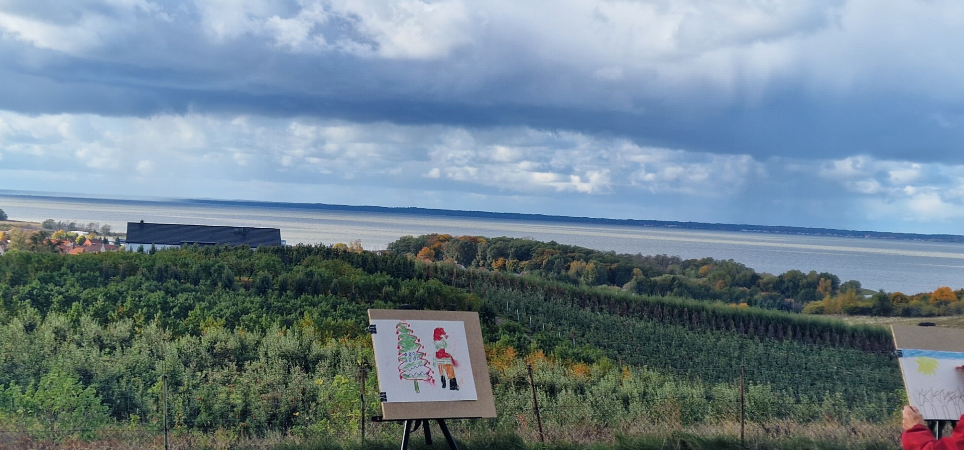 Natomiast nasi nowi znajomi wykazali się dużymi umiejętnościami artystycznymi. Pani Krystyna, właścicielka Chudego, wyczarowała pejzaż z tolkmickim kościołem unoszącym się w bezmiarze obłoków płynących po niebie i wód płynących w zalewie, tworzących jedno niebiesko-czarne tło, pochłaniające wzrok i nasze myśli.