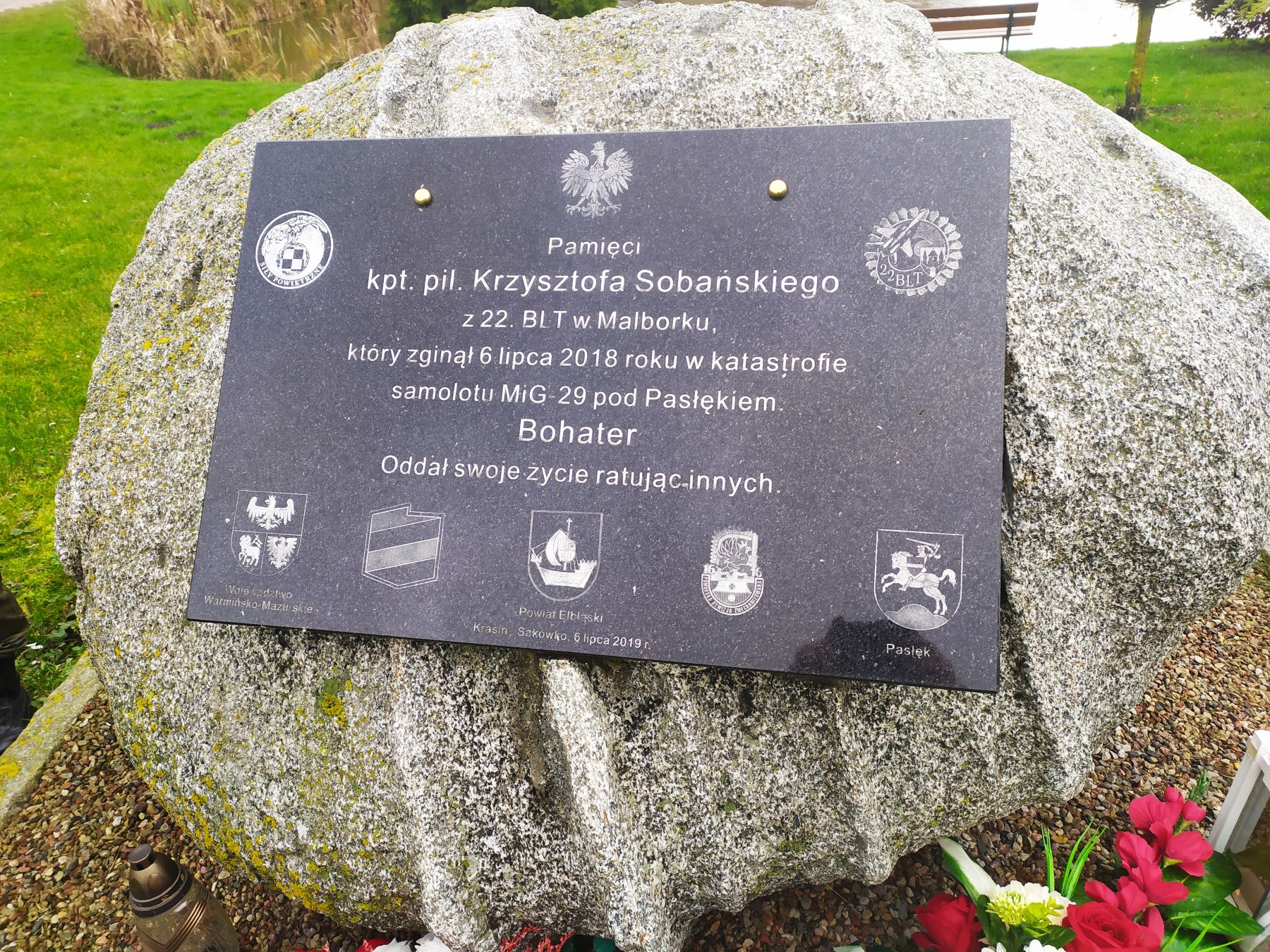 W Krasinie pod Pasłękiem, w środę 29 października 2025 r., odbyła się uroczystość złożenia wiązanek kwiatów i zapalenia zniczy pod obeliskiem ku pamięci kpt. pil. Krzysztofa Sobańskiego, który zginął w katastrofie myśliwca MiG-29. Pilot, wiedząc o awarii samolotu, prawdopodobnie zrobił wszystko, aby maszyna nie spadła na tereny zabudowane. Na pamiątkowej tablicy widnieją słowa: „Bohater. Oddał swoje życie, ratując innych.”