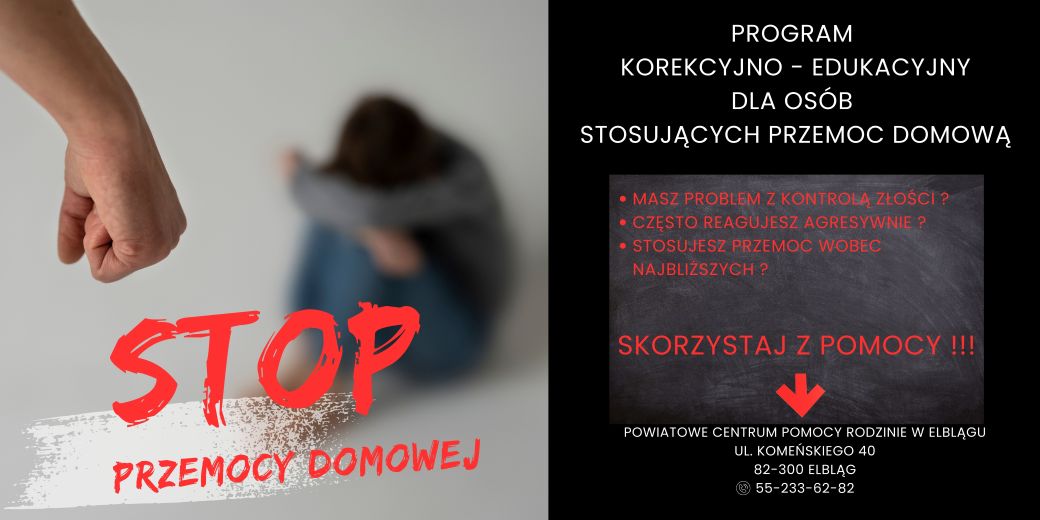 Powiatowe Centrum Pomocy Rodzinie w Elblągu rozpoczęło rekrutację uczestników do Programu korekcyjno – edukacyjnego dla osób stosujących przemoc domową zamieszkałych na terenie Powiatu Elbląskiego.