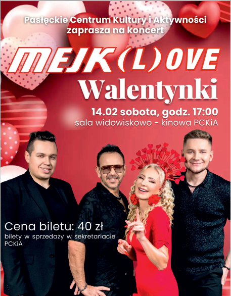 Pasłęckie Centrum Kultury i Aktywności zaprasza na wyjątkowy walentynkowy koncert, który rozgrzeje serca i wypełni wieczór miłością, radością i świetną energią. Już 14 lutego (sobota) o godz. 17:00 scena sali widowiskowo-kinowej PCKiA należeć będzie do zespołu MEJK – gwarancja dobrej zabawy i niezapomnianych emocji.