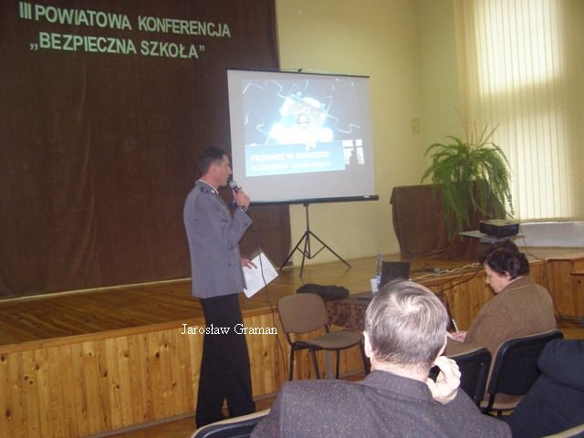 Wzięli w niej udział dyrektorzy szkół z terenu naszego powiatu, przedstawiciele rad rodziców, przedstawiciele Kuratorium Oświaty, Poradni Psychologiczno-Pedagogicznych z Pasłęka oraz Elbląga, policji, straży pożarnej oraz uczniowie. W programie konferencji znalazły się wykłady dr Elżbiety Zubrzyckiej Prezes Gdańskiego Wydawnictwa Psychologicznego Waldemara Czerskiego psychologa z KMP w Elblągu Marceliny Tatarynowicz psycholog z Poradni Psychologiczno-Pedagogicznej w Pasłęku Jarosława Gramana specjalista Zespołu Prewencji KMP w Elblągu).Wykład dr Elżbiety Zubrzyckiej pt.” Gdzie kończy się zabawa a zaczyna niedopuszczalne zachowanie” poruszał ważny problem agresji wśród dzieci i młodzieży agresywne zachowanie w klasie, granice dopuszczalnych zachowań, problem „klasowego dręczyciela”). Wykład wzbudził szczególne zainteresowanie zgromadzonych, w szczególności młodzieży.Psycholog Waldemar Czerski przedstawił w swoim wykładzie postawy, jakie przyjmują ofiary wobec przemocy. Policyjne statystyki zawierające dane z terenu naszego powiatu dotyczące przemocy przedstawił aspirant sztabowy Jarosław Graman.Marcelina Tatarynowicz psycholog z PPP z Pasłęka zapoznała uczestników konferencji z wynikami badań ankietowych uczniów I i II klas gimnazjum oraz I i II klas szkół ponadgimnazjalnych. Podsumowania realizacji programu „Bezpieczna szkoła” w 2008 roku dokonała Gabriela Effenberg Naczelnik Wydziału Promocji Powiatu, Edukacji, Kultury i Sportu.