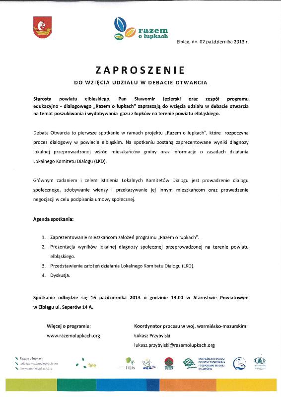 zaproszenie do wzięcia udziału w debacie otwarcia na temat poszukiwania i wydobywania gazu z łupków na terenie powiatu elbląskiego