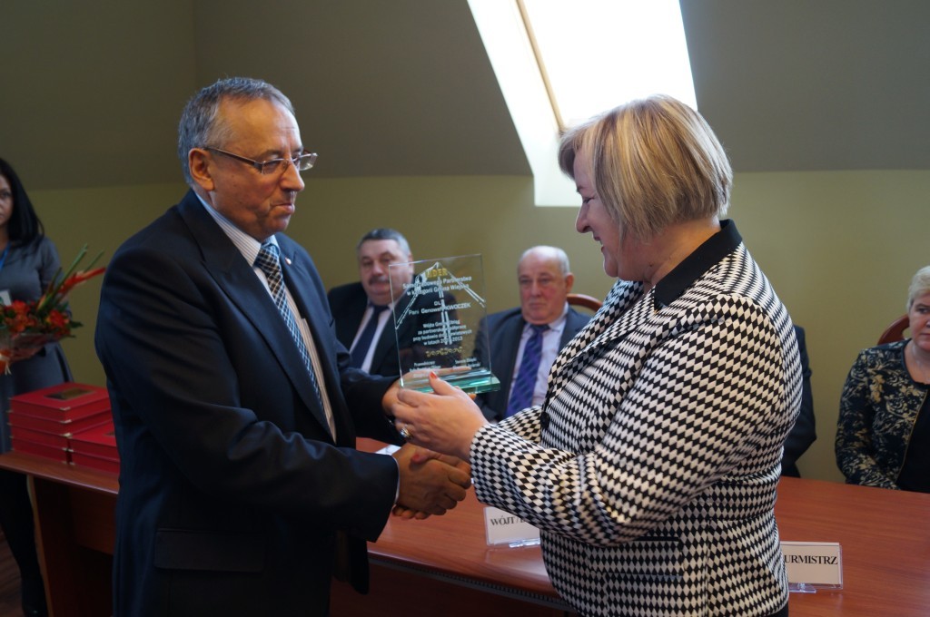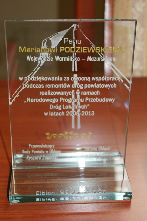 W imieniu wojewody okolicznościową statuetkę odebrała Wiesława Raszkowska, zastępca dyrektora Wydziału Certyfikacji i Funduszy Europejskich Urzędu Wojewódzkiego w Olsztynie. W swoim wystąpieniu podkreśliła wysoką jakość merytoryczną dokumentacji przygotowywanej przez powiat elbląski w ramach aplikowania o środki finansowe na remonty dróg.