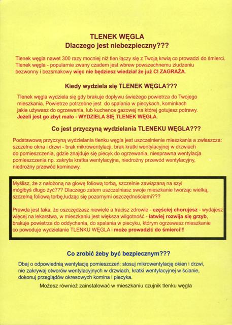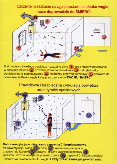 Mając na uwadze bezpieczeństwo mieszkańców naszego regionu, włączamy się w akcję popularyzującą elementarne zasady właściwego eksploatowania urządzeń grzewczych, poprzez rozpowszechnienie na administrowanym terenie poniższych ulotek. Mamy nadzieję, iż akcja ta przyczyni się do zwiększenia świadomości mieszkańców powiatu elbląskiego, odnośnie powagi zagrożenia zatruciem tlenkiem węgla.