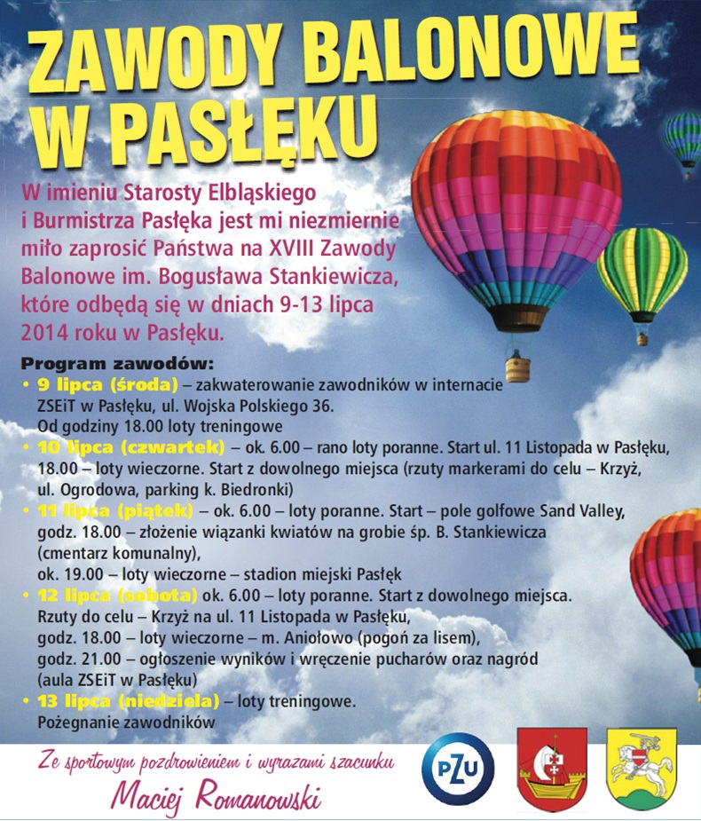 W imieniu Starosty Elbląskiego i Burmistrza Pasłęka jest mi niezmiernie miło zaprosić Państwa na XVIII Zawody Balonowe im. Bogusława Stankiewicza, które odbędą się w dniach 9-13 lipca 2014 roku w Pasłęku.