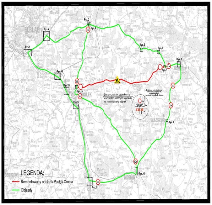 W załączeniu mapka z istniejącymi objazdami przy przebudowie drogi wojewódzkiej nr 513 na odcinku Pasłęk-Orneta.