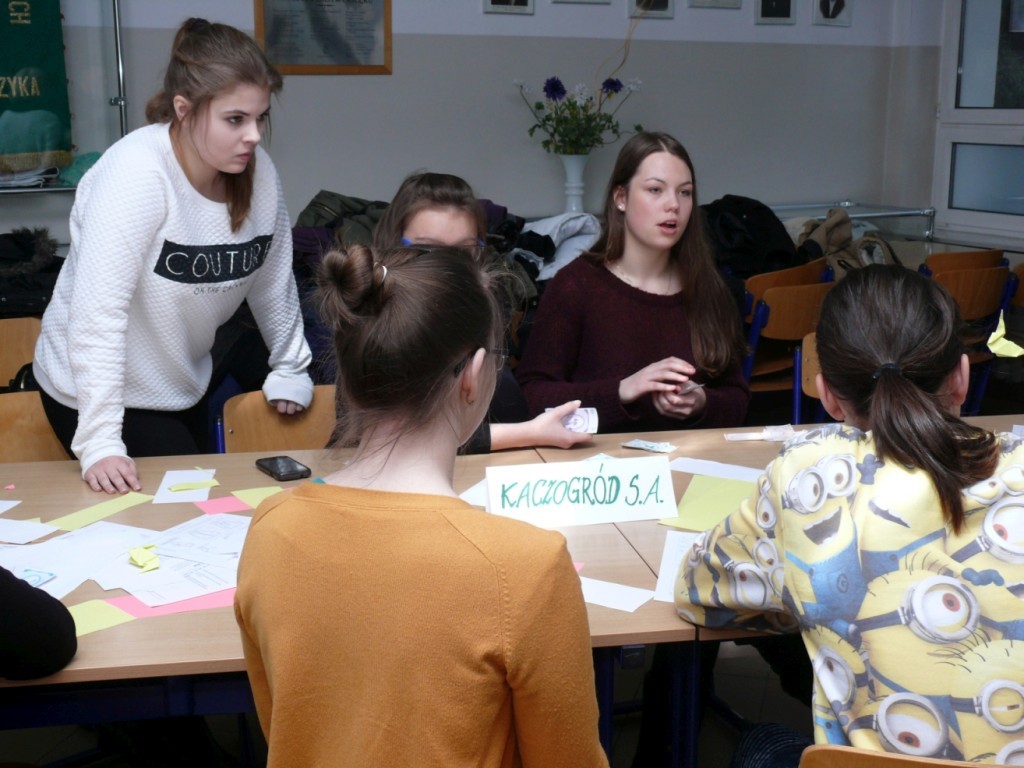 W pierwszej części warsztatów uczniowie gimnazjum przy współpracy z uczniami klas II i III technikum kształcącego w zawodzie technik ekonomista prowadzili przedsiębiorstwa produkcyjne. Zadaniem uczniów była produkcja i sprzedaż kaczek wykonanych techniką origami. Druga część warsztatów odbywała się w pracowni komputerowej, gdzie młodzież gimnazjum mogła sprawdzić swoje umiejętności podejmowania decyzji w ekonomicznych grach edukacyjnych Moja firma i Finanse bez tajemnic. Warsztaty przeprowadzili nauczyciele ZSEiT: Dorota Orłowska-Łuczka, Joanna Kisielewska i Ryszard Barszcz.