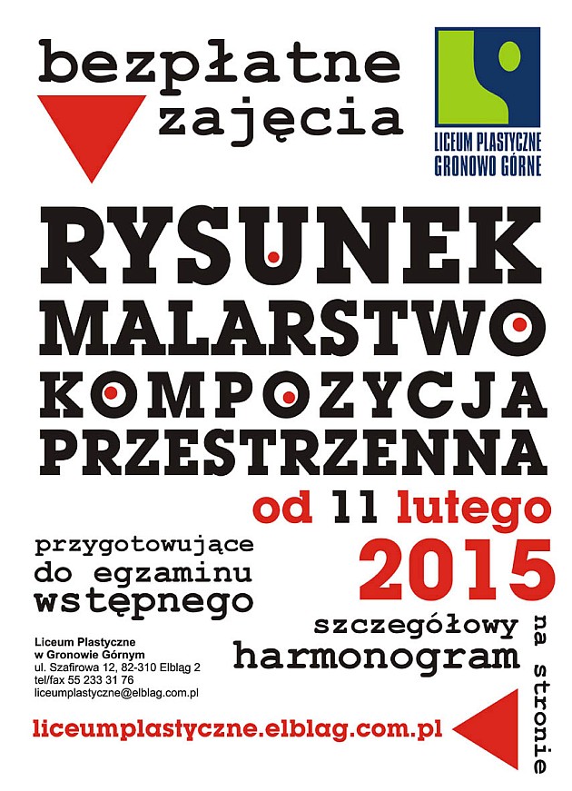 Uczniów III klasy gimnazjum zainteresowanych kontynuowaniem nauki w Liceum Plastycznym zapraszamy na konsultacje i zajęcia, podczas których można będzie poćwiczyć umiejętności z następujących dziedzin plastycznych: rysunku, malarstwa i kompozycji przestrzennej a także historii sztuki. Pierwsze zajęcia rozpoczynają się 11 lutego 2015 r.