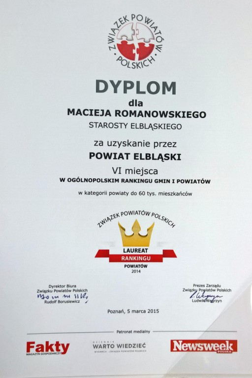 Powiat Elbląski już od kilku lat plasuje się w pierwszej dziesiątce plebiscytu: w edycji Rankingu 2012 – zajęliśmy VIII miejsce, w edycji 2013 – VII miejsce, a obecnie miejsce VI. Wskazuje to na wytrwałość w dążeniu władz Powiatu Elbląskiego do osiągania coraz lepszych not w funkcjonowaniu samorządu.