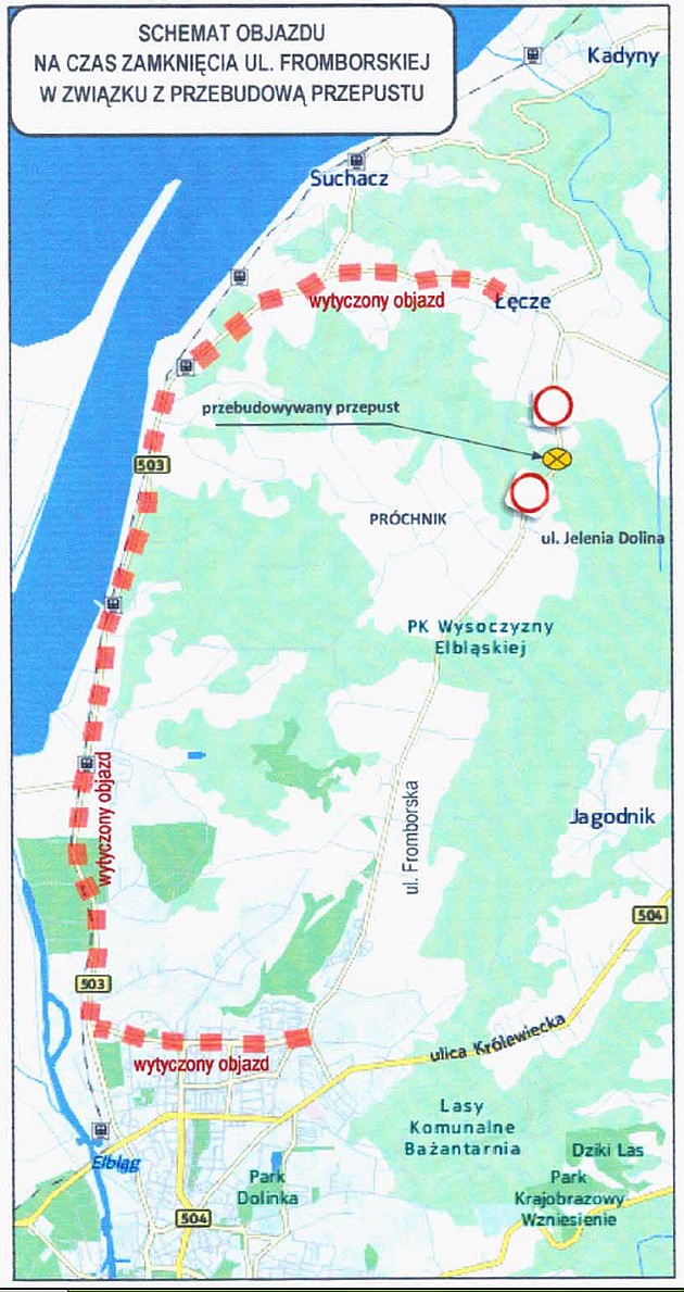 -ulica Fromborska przed miejscowością Łęcze) remont przepustu w okresie od 19.03.2015r - 30.04.2015r – objazd do Elbląga drogą powiatową nr 1132N i wojewódzką nr 503 załączona mapa objazdu