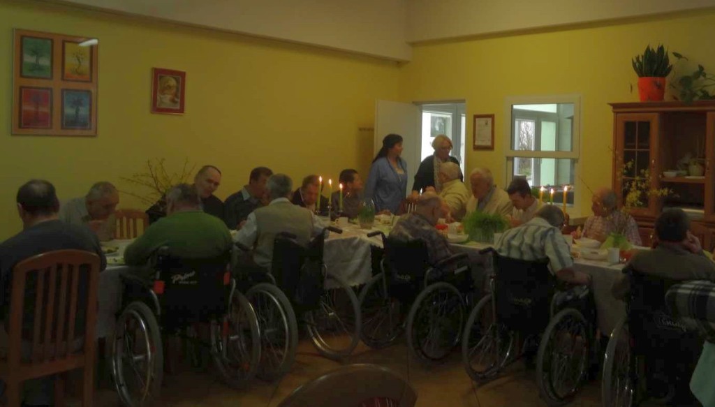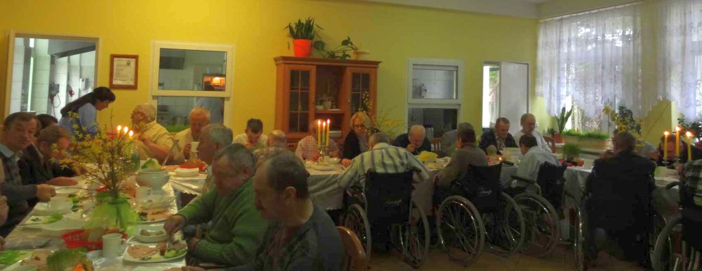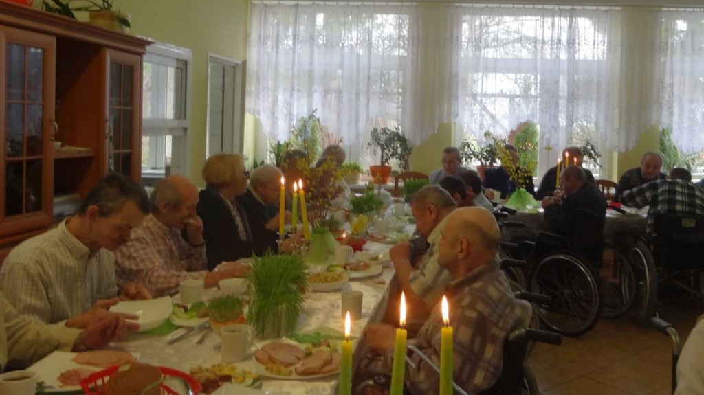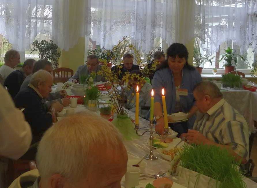 Poświęcenie pokarmów w Wielką Sobotę było ostatnim etapem przygotowań. W niedzielę rano odbyło się uroczyste śniadanie, w którym wzięli udział mieszkańcy wraz z Panią Dyrektor, na którym podawane były tradycyjne potrawy przygotowane przez pracowników kuchni DPS.
