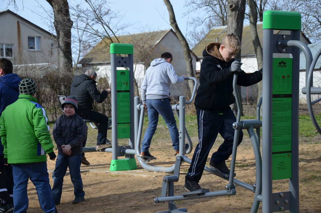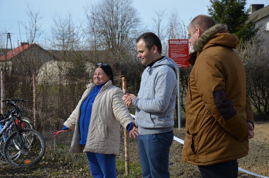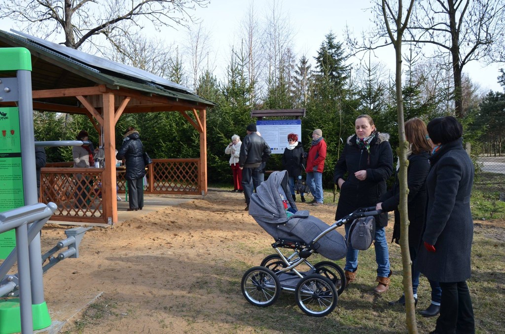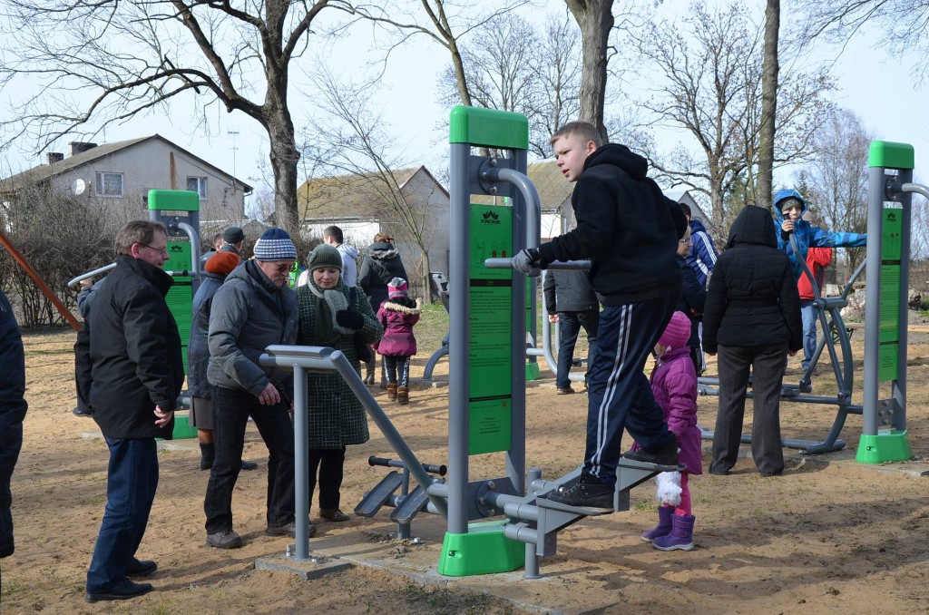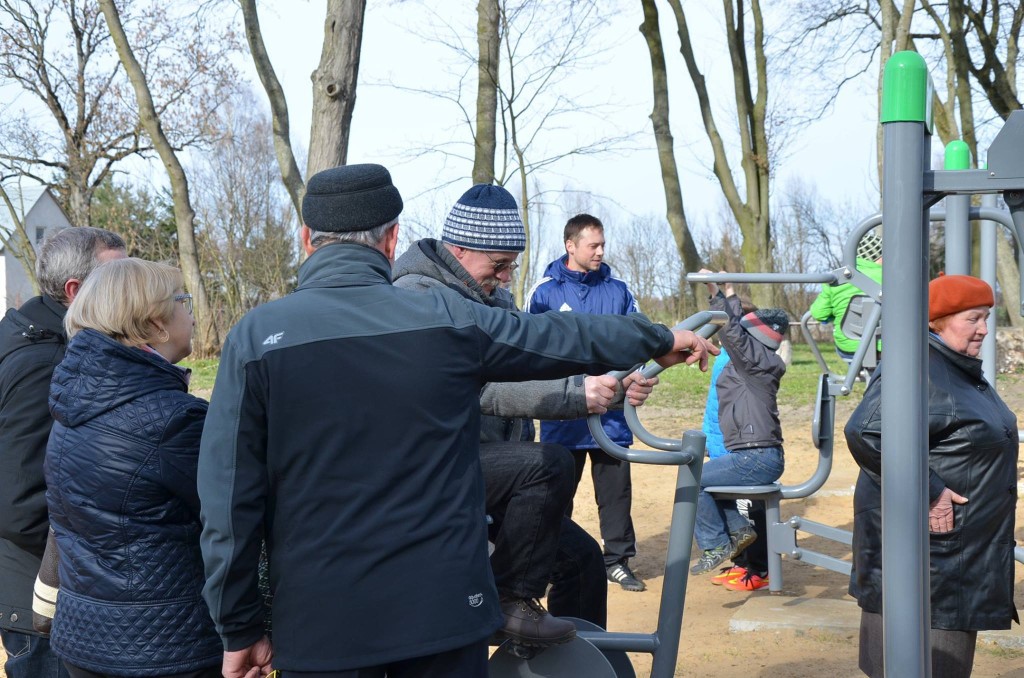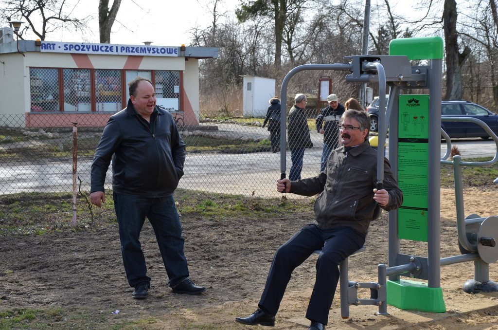Przygotowano miejsca dla urządzeń do ćwiczeń na powietrzu – razem pięć podwójnych stanowisk w tym: biegacz, koła Tai Chi, trenażer talii i bioder – Twister, prostownik pleców, trenażer eliptyczny – orbitrek, wioślarz, motylek – rozpiętki, rower treningowy, krzesełko do podnoszenia masy ciała – wyciąg górny oraz stepper. Ostatnim krokiem było umieszczenie tablicy informacyjnej wraz z regulaminem. W wykonaniu powyższych czynności brali udział mieszkańcy oraz wolontariusze, niejednokrotnie pracując do późnego wieczora. Czekamy aż teren wokół centrum ładnie się zazieleni, jeszcze odrobinę przypomina niedawny plac budowy.