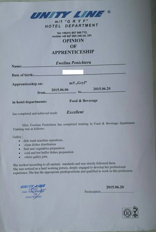 Na zakończenie uczestnik szkolenia otrzymuje pisemne zaświadczenie o odbyciu praktyki na promie. Zaświadczenie w formie opinii, w dwóch wersjach językowych zawiera zakres wykonywanych prac, okres odbywania praktyk oraz ocenę.