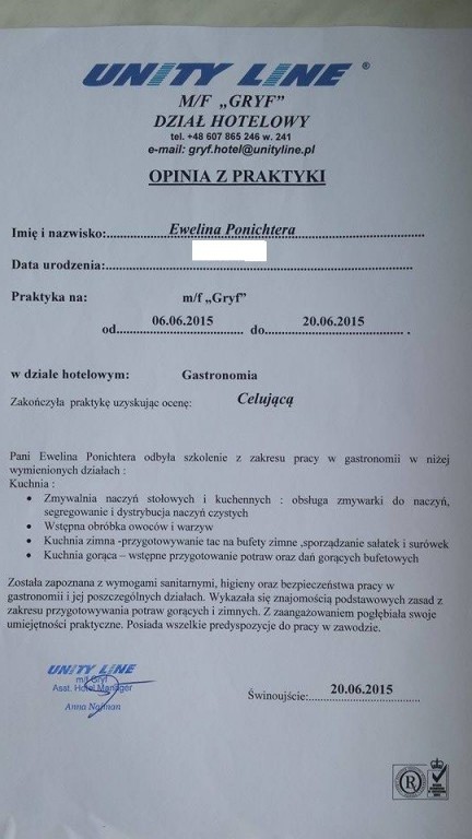 Praktyki odbyte na promie „Gryf” Unity Line były zarówno świetną przygodą, jak i lekcją przygotowującą nas do pracy w zawodzie kucharza. Na promie spędziliśmy dwa tygodnie. W tym czasie nauczyliśmy się obsługi wielu sprzętów i urządzeń gastronomicznych, a także, co w pracy bardzo ważne - działania w zespole. Atmosfera w pracy i w czasie wolnym była miła. Kucharze i cała załoga byli świetni. Pracowaliśmy dwa razy dziennie po 5 godzin. Naszym zdaniem nauczyliśmy się wiele przez ten czas. Polecamy i zachęcamy do odbycia praktyk w firmie Unity Line, ponieważ jest to fajne i pouczające doświadczenie. Mamy nadzieję, że w przyszłym roku uda nam się ponownie odbyć tam praktyki”.