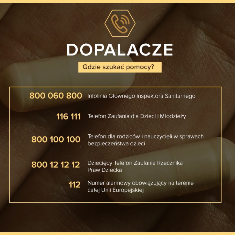 800060800 – Bezpłatna, całodobowa infolinia Głównego Inspektora Sanitarnego. Pod tym numerem telefonu możemy uzyskać informacje na temat negatywnych skutków zażywania dopalaczy oraz o możliwościach leczenia. Infolinia jest także przeznaczona dla rodziców, którzy mają wątpliwości czy ich dzieci zażywają dopalacze. Na infolinię GIS można przekazywać także informacje, które mogą ułatwić służbom dotarcie do osób handlujących tymi nielegalnymi substancjami.