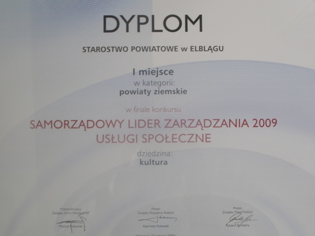 23 czerwca w Warszawie w siedzibie Senatu Rzeczpospolitej Polskiej odbyła się konferencja podsumowująca konkurs „Samorządowy Lider Zarządzania 2009 , usługi społeczne”. Celem konkursu organizowanego corocznie przez Związek Miast Polskich, Związek Gmin Wiejskich RP, Związek Powiatów Polskich i Norweski Związek Władz Lokalnych i Regionalnych jest wybranie i upowszechnianie dobrych praktyk w zakresie świadczonych usług obywatelom przez administrację samorządową i podległe jej podmioty. W 2009 roku oceną objęte były takie dziedziny jak kultura, pomoc społeczna i oświata. Konkurs jest jednym z elementów szerokiego projektu „Budowanie potencjału instytucjonalnego samorządów dla lepszego dostarczania usług publicznych 2007-2011)”, współfinansowanego ze środków Norweskiego Mechanizmu Finansowego.