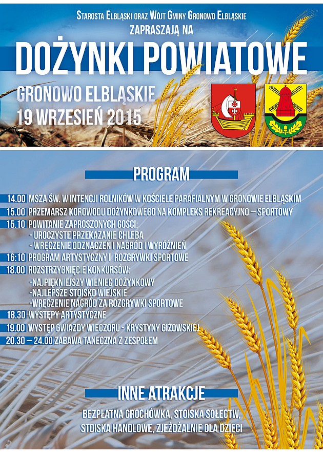 Starosta Elbląski i Wójt Gminy Gronowo Elbląskie zapraszają na Dożynki Powiatowe, które odbędą się w Gronowie Elbląskim w sobotę 19 września. Na uczestników czeka moc atrakcji w postaci konkursów artystycznych, zawodów sportowych, występów muzycznych i zabawy tanecznej.