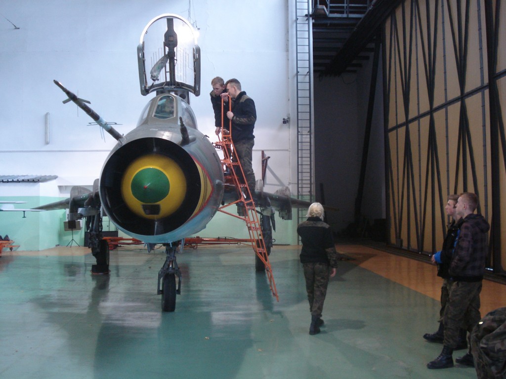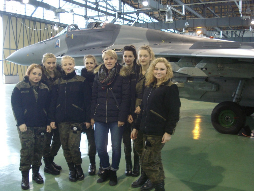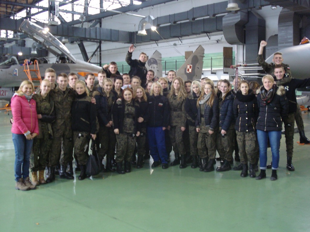 W imieniu dowódcy Bazy uczniów przyjął rzecznik prasowy mjr Dariusz Mazurkiewicz, który w krótkim zarysie przedstawił historię bazy i jej obecne zadania. Zwiedzającym umożliwiono obejrzenie słynnych samolotów MIG 21 i innych używanych w przeszłości przez pilotów bazy –TS ISKRA, LIM, SU-22, samolotów szkolno-bojowych, w tym słynnej IRYDY wykorzystywanej do szkolenia podchorążych w Wyższej Szkole Oficerskiej w Dęblinie. Uczniowie mieli okazję obejrzenia wnętrza kabiny pilota, urządzeń nawigacyjnych i celowniczych. Obejrzeli również przygotowanie MIG-29 do planowanych lotów.
