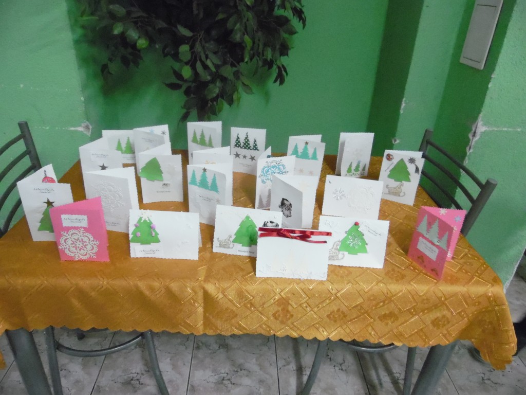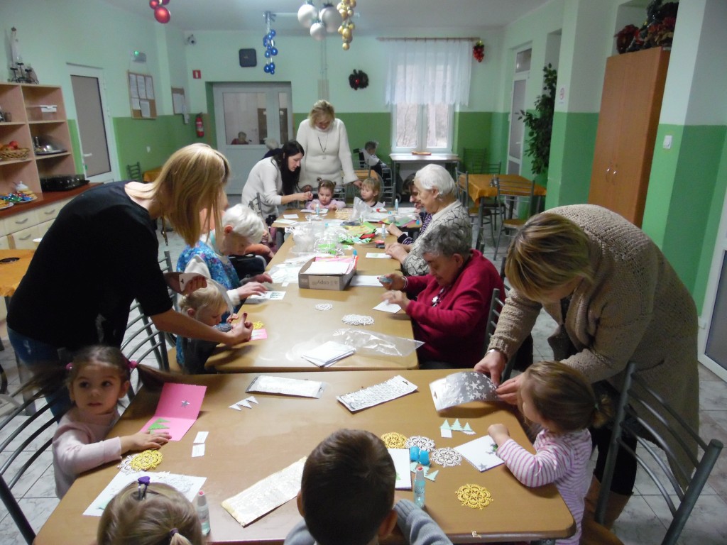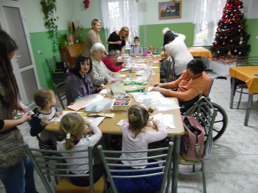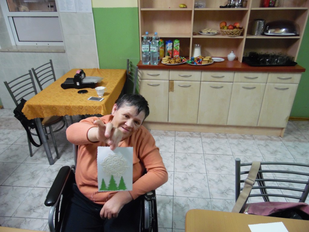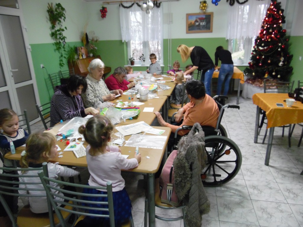 Dzieci razem z mieszkankami tworzyły karty świąteczne. Razem wycinaliśmy, wyklejaliśmy, zdobiliśmy używając naszej wyobraźni piękne pocztówki. Podczas pracy śpiewaliśmy kolędy. Dzieci przygotowały również piosenkę, którą zaśpiewały dla nas.