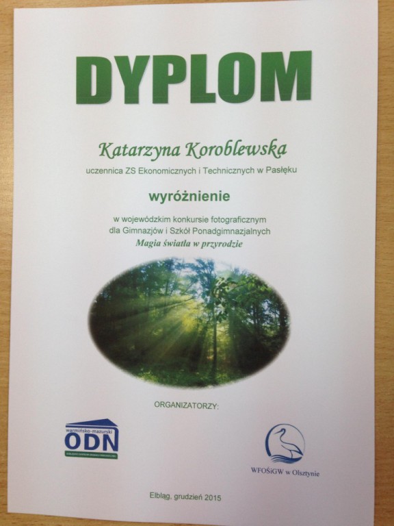 11 grudnia 2015 r. w siedzibie Warmińsko-Mazurskiego Ośrodka Doskonalenia Nauczycieli w Elblągu nastąpiło rozstrzygnięcie konkursu fotograficznego pt. "Magia światła w przyrodzie". Wśród najlepiej ocenionych fotografii znalazła się także praca wykonana przez Katarzynę Koroblewską uczennicę ZSEiT w Pasłęku.