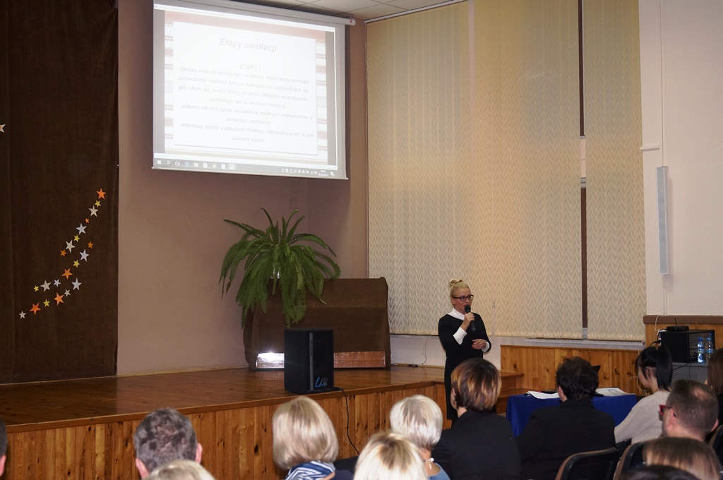 Tematem przewodnim tegorocznej konferencji były mediacje rówieśnicze. Wykład „Mediacje, jako sposób rozwiązywania konfliktów – mediacje rówieśnicze” przeprowadziła pani Anna Olszewska prezes Zarządu Elbląskiego Centrum Mediacji i Aktywizacji Społecznej. Omówiła pojęcie mediacji, jako alternatywny,dobrowolny, inny sposób wobec drogi sądowej rozwiązywania sporów pomiędzy stronami z udziałem bezstronnej i neutralnej osoby mediatora. Ponadto przedstawiła zasady i cele mediacji, korzyści płynące z jej korzystania oraz jej zasady.