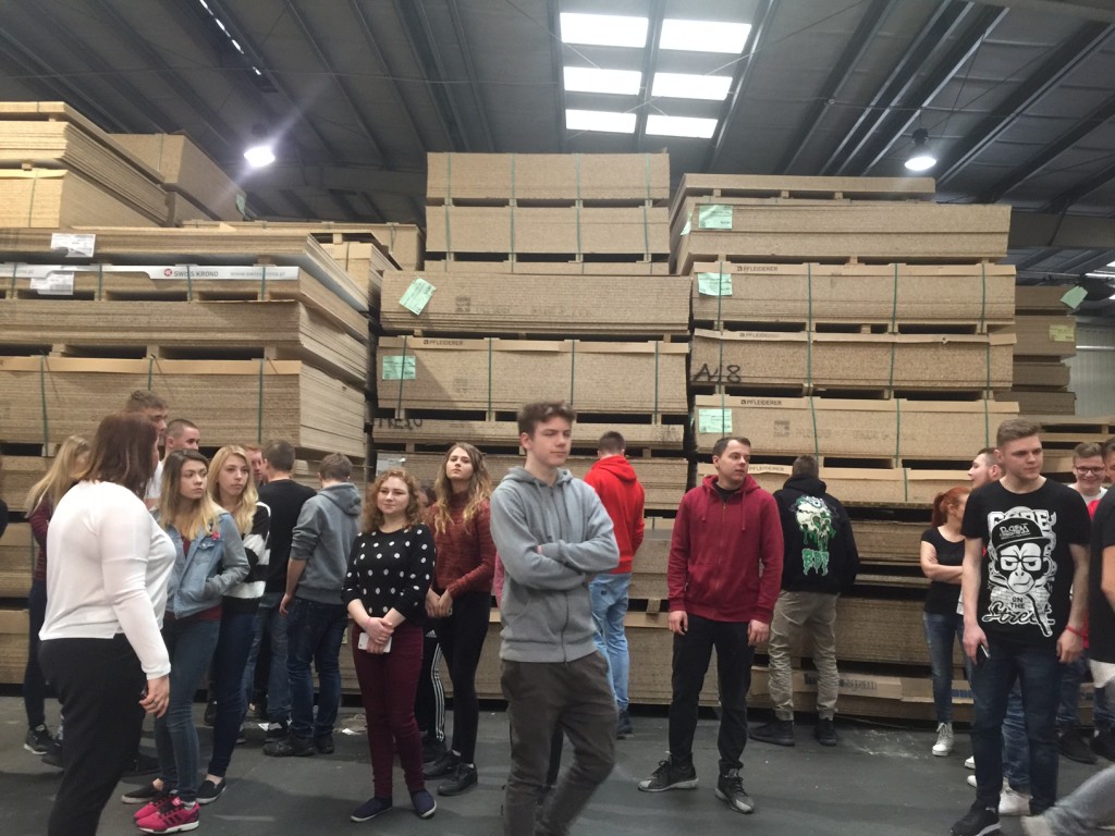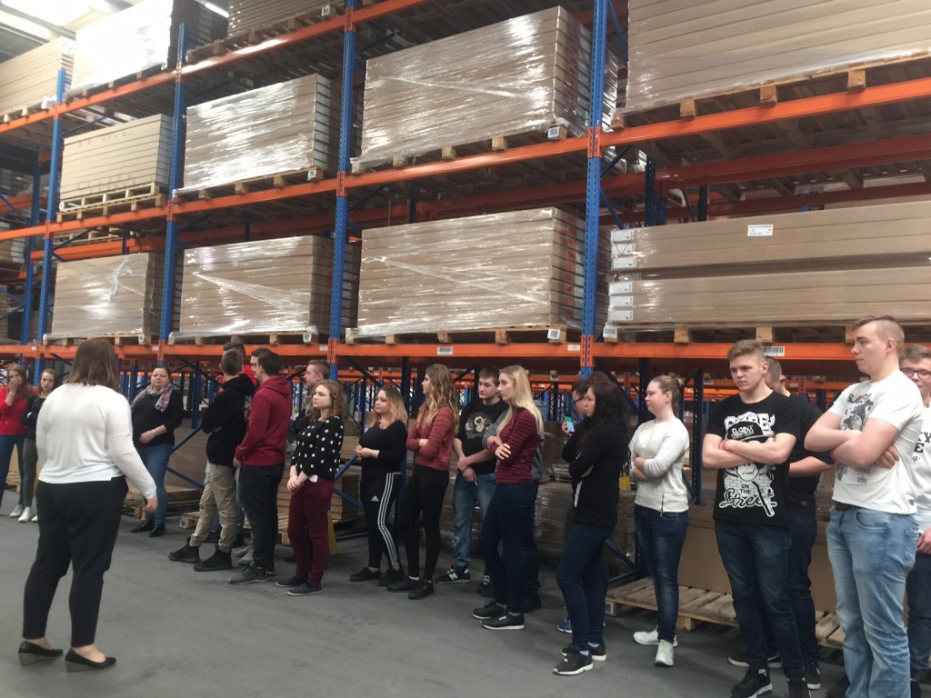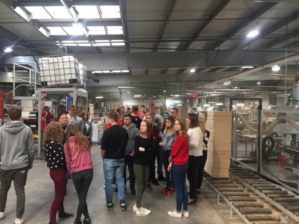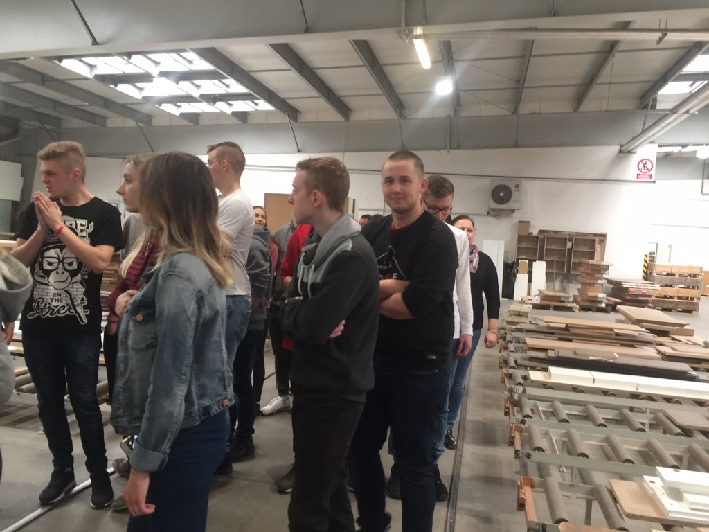 Zwiedzając hale produkcyjne, młodzież obserwowała kolejne etapy produkcji – od cięcia płyty, przez jej oklejanie, wiercenie i wreszcie magazynowanie i załadunek. Uczniowie poznali też ogólne zasady działania systemu WMS (Warehouse Management System – systemu magazynowego).
