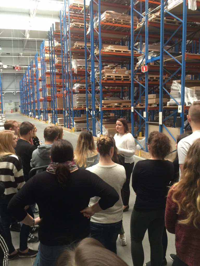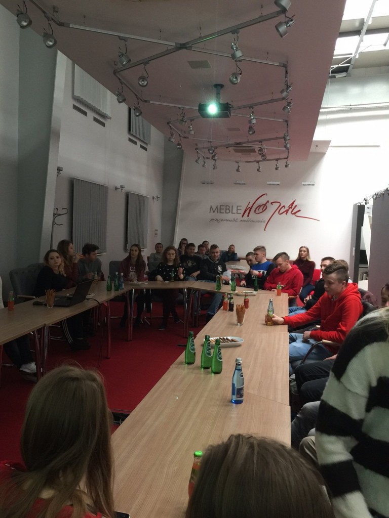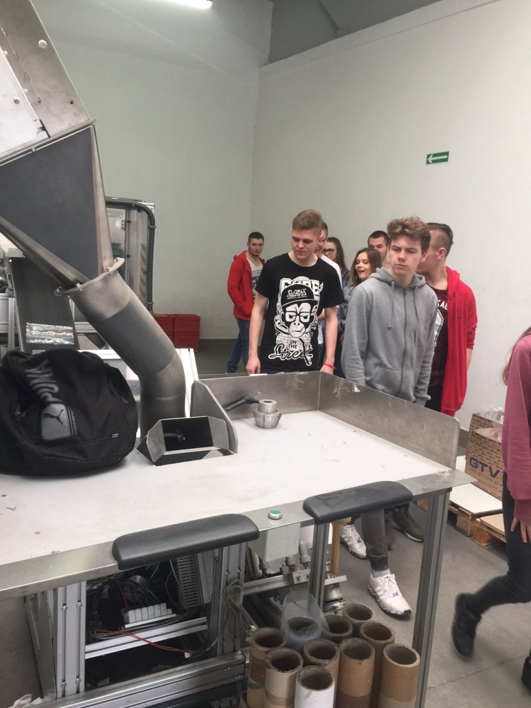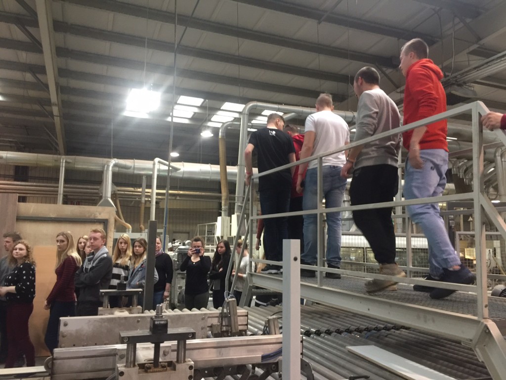 Zwiedzając hale produkcyjne, młodzież obserwowała kolejne etapy produkcji – od cięcia płyty, przez jej oklejanie, wiercenie i wreszcie magazynowanie i załadunek. Uczniowie poznali też ogólne zasady działania systemu WMS (Warehouse Management System – systemu magazynowego).
