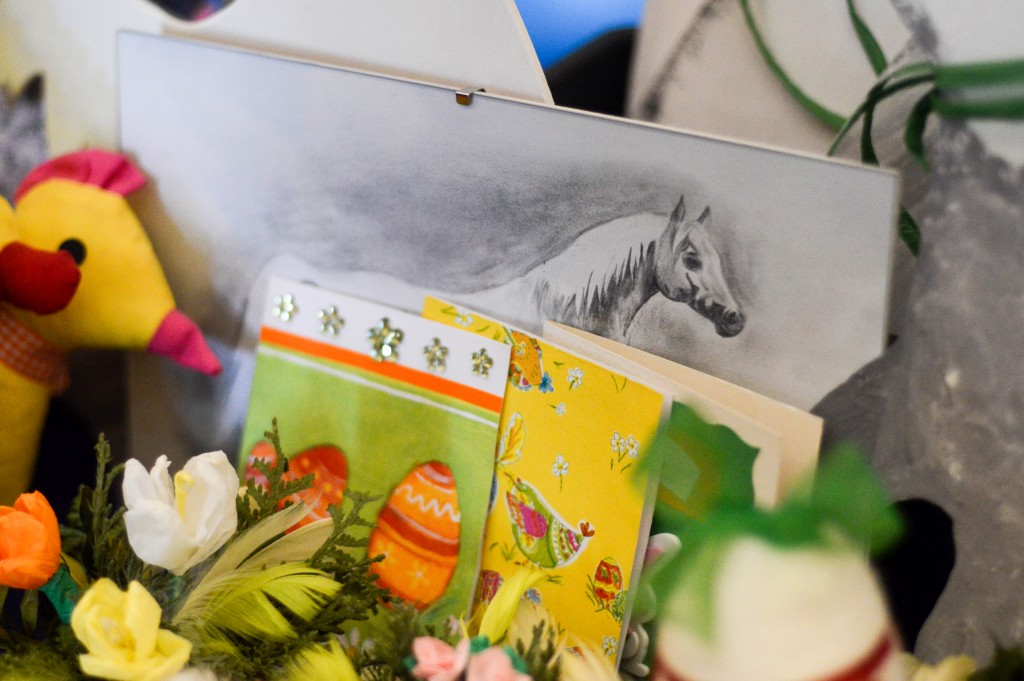Można było również zakupić ręcznie wykonane kartki wielkanocne. Na stoisku nie zabrakło również pysznych ciast. Wszystkim, którzy pomogli nam w przygotowaniu kiermaszu, składamy serdeczne podziękowania.