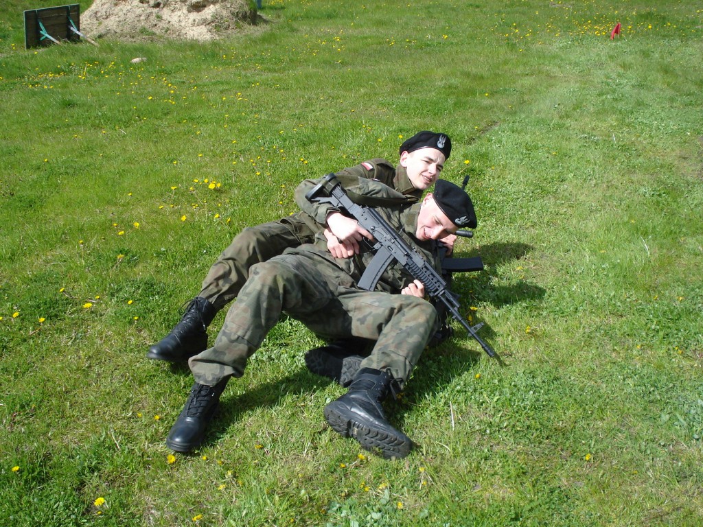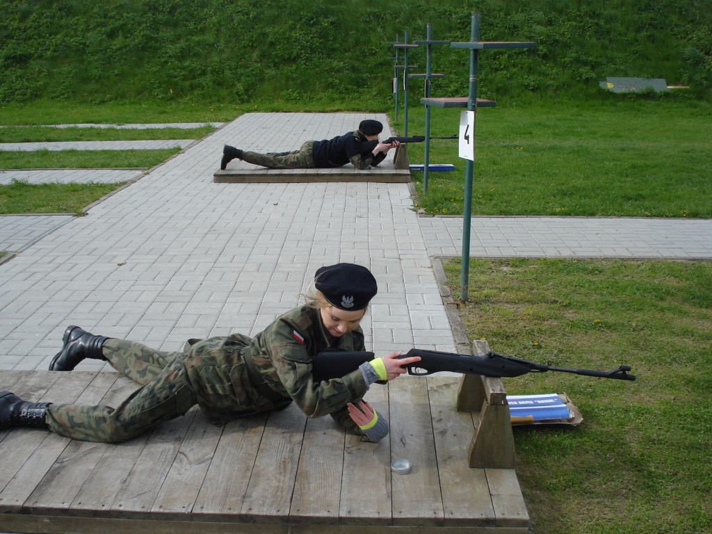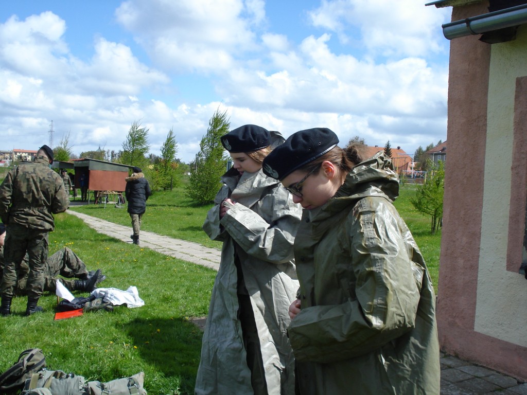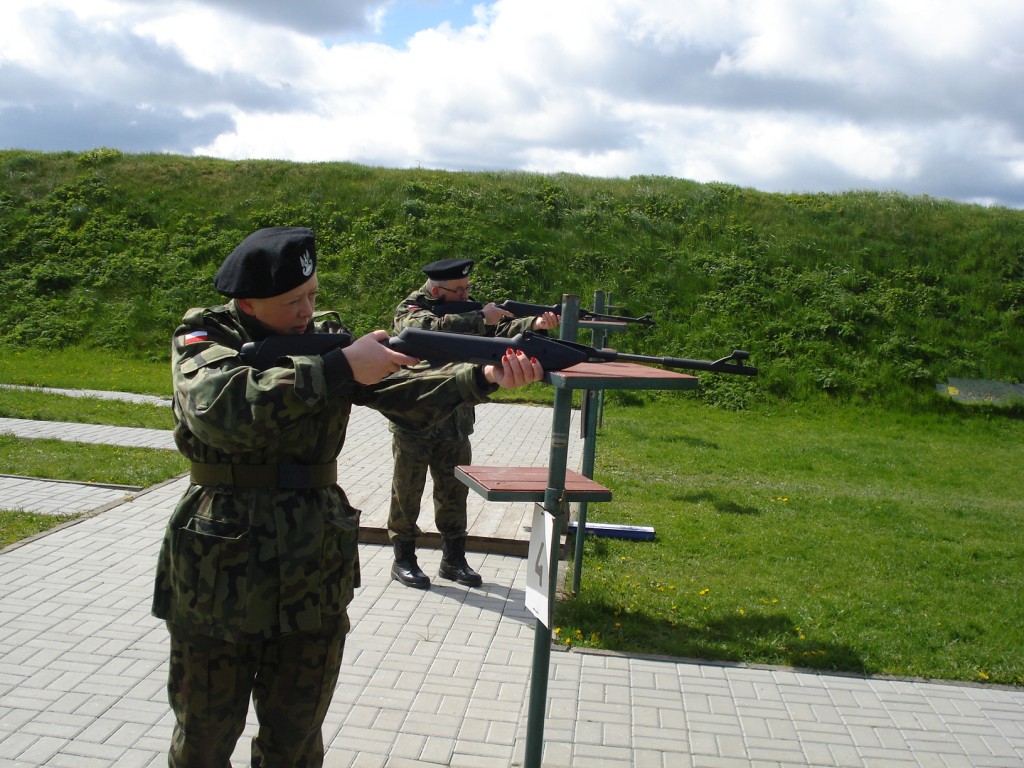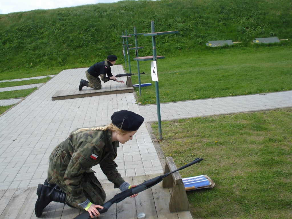 We wtorek po śniadaniu odbyło się strzelanie z karabinku pneumatycznego. Z powodu pogody wyniki nie były rewelacyjne. Z zimna drętwiały palce, nikt nie był przygotowany na to, aby zabrać ze sobą rękawiczki. Za to „na punktach” dużo się nauczyliśmy, czyli poruszania się w terenie różnymi sposobami, przenoszenia amunicji w skrzyniach, zakładania masek pgaz i odzieży ochronnej, składania i rozkładania kbk AK, rzutu granatem, holowania rannego z pola walki.