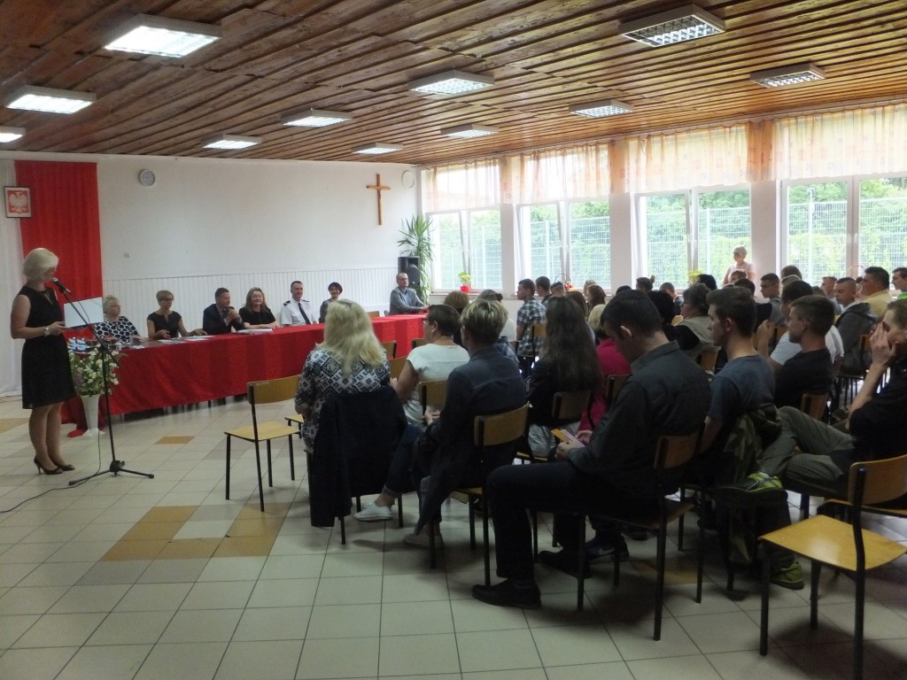 Po powitaniu przybyłych gości przez prowadzącą uroczystość Małgorzatę Wolską, głos zabrała dyrektor Maria Kizyk, która podsumowała kończący się rok szkolny, podziękowała gronu pedagogicznemu za wykonywanie swojej misji i za podejmowanie cennych inicjatyw i twórczych działań, pracownikom szkoły za trud i wysiłek w codziennej pracy, a obecnym przedstawicielom jednostek samorządowych - za wieloletnią współpracę. Dokonała podsumowania osiągnięć absolwentów gimnazjum, ze szczególnym uwzględnieniem tych, którzy w całym roku szkolnym nie szczędzili trudu i wysiłku, aby rozwijać swoje talenty i umiejętności. Podziękowała także kierownictwu i pracownikom Ośrodka Szkolenia i Wychowania OHP w Pasłęku za współpracę w realizacji wspólnych celów.