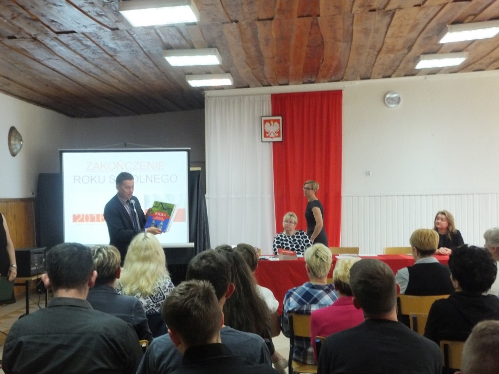 Następnie głos zabrał wicestarosta Zbigniew Lichuszewski. W swoim wystąpieniu pogratulował młodzieży i nauczycielom osiągniętych wyników w nauce i z egzaminu gimnazjalnego oraz życzył udanych wakacji. Na ręce pani dyrektor przekazał upominek - książkę traktującą o najbardziej malowniczych rejonach naszego kraju ojczystego. Teresa Brewka i Tomasz Cybulski również winszowali słuchaczom i pedagogom osiągniętych wyników i życzyli wspaniałego odpoczynku wakacyjnego.