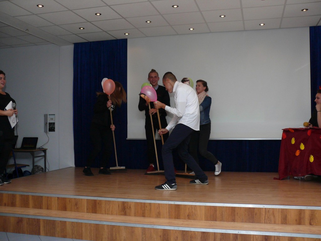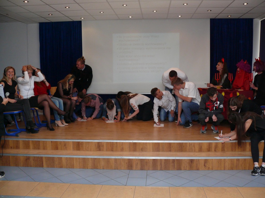Tradycyjnie pierwszoklasiści musieli zmierzyć się z zadaniami, które postawili przed nimi uczniowie drugich klas. Przygotowali oni 7 konkurencji, a pierwszaki wykazały się wolą walki, hartem ducha i poczuciem humoru. Uczniowie wykonywali koci makijaż, rysowali karykatury wychowawców i przeprowadzali z nimi wywiady. Wychowawcy z kolei ćwiczyli swoje umiejętności kulinarne, ubijając pianę z białek. Najwięcej punktów zdobyła klasa I SB (stolarz), która wylosowała słodką nagrodę.