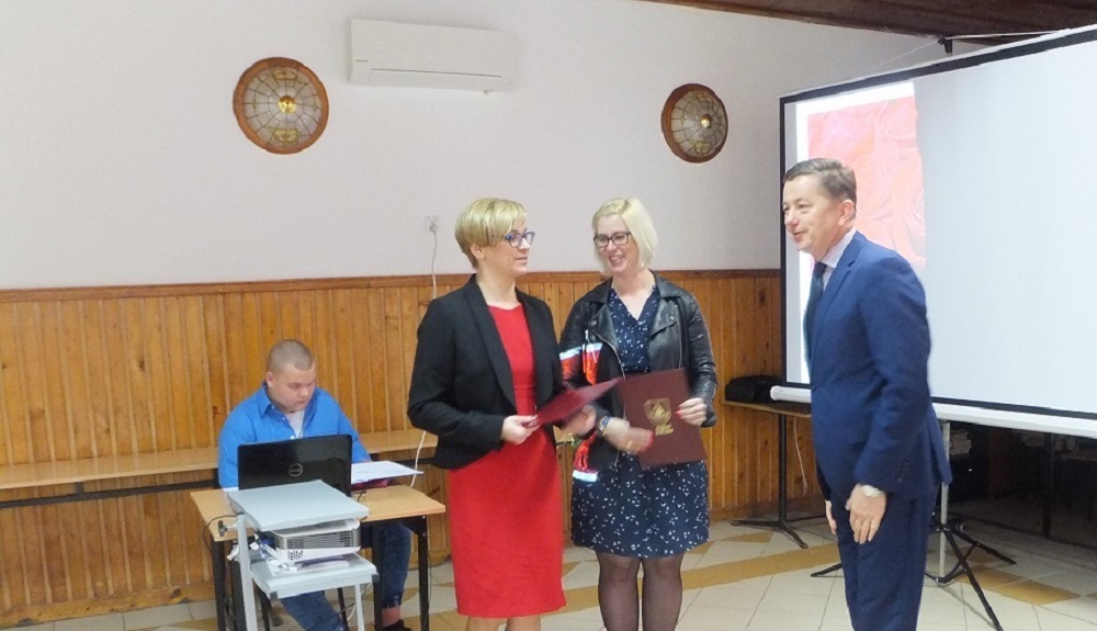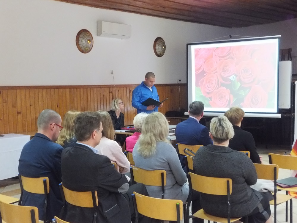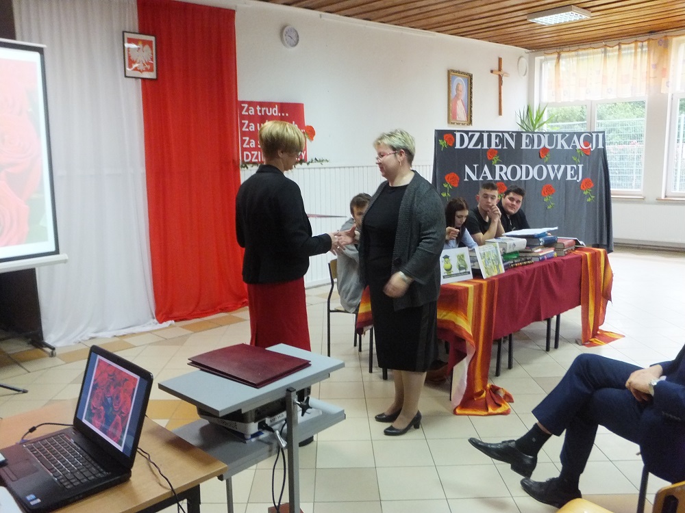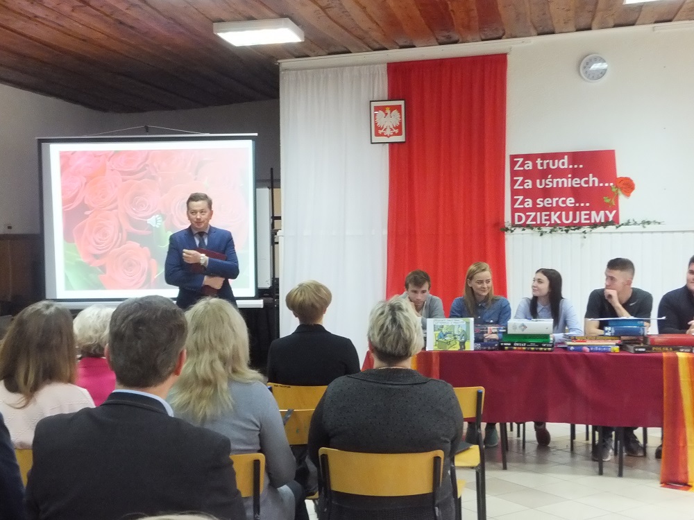 Następnie głos zabrał Zbigniew Lichuszewski, który w kilku miłych i ciepłych słowach złożył życzenia nauczycielom. Życzył im przede wszystkim zdrowia, radości z podejmowanych przedsięwzięć i sukcesów zawodowych. Wręczył również dyrektor Marii Kizyk i nauczycielce języka polskiego Małgorzacie Wolskiej Nagrody Starosty Elbląskiego.