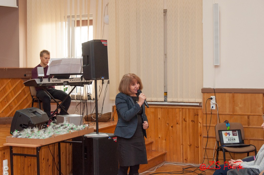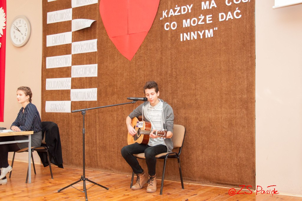 Zainspirowani pewnym serwisem informacyjnym z telewizji Joanna Grzyb wraz z Jakubem Aleksandrowiczem stworzyli niebanalną atmosferę dzięki przeprowadzonemu wywiadowi, w którym uczeń wypowiedział się na temat danego święta. Wolontariusz przybliżył wszystkim również korzyści jakie płyną z okazywania szlachetnego serca innym osobom, między innymi samorealizacji, współpracy, poczucia bycia częścią ważnego dzieła, a także przeżycia pięknej przygody. Tym samym zachęcił uczniów do podjęcia się owocnego trudu włączenia się do Szkolnego Koła Wolontariatu.