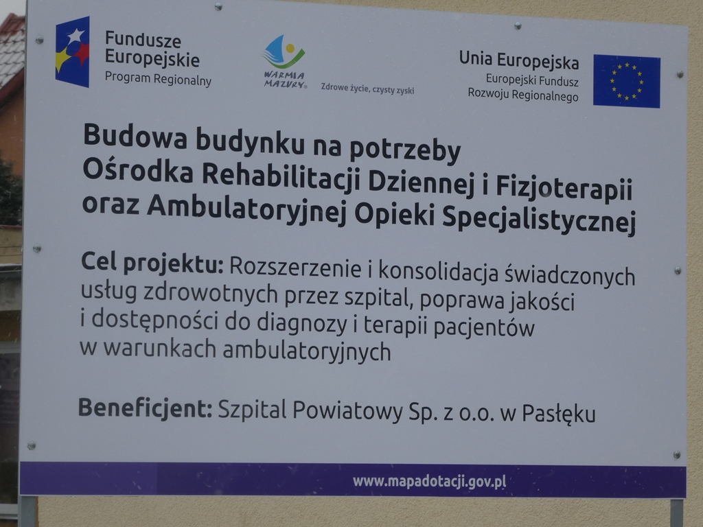 W dniu 30 sierpnia 2017 roku została podpisana umowa pomiędzy województwem Warmińsko Mazurskim a Szpitalem Powiatowym w Pasłęku na realizację projektu “Budowa budynku na potrzeby Ośrodka Rehabilitacji Dziennej i Fizjoterapii oraz Ambulatoryjnej Opieki Specjalistycznej”