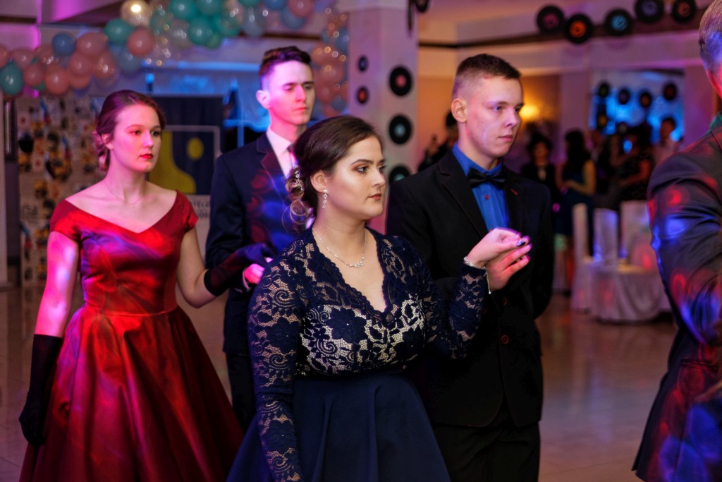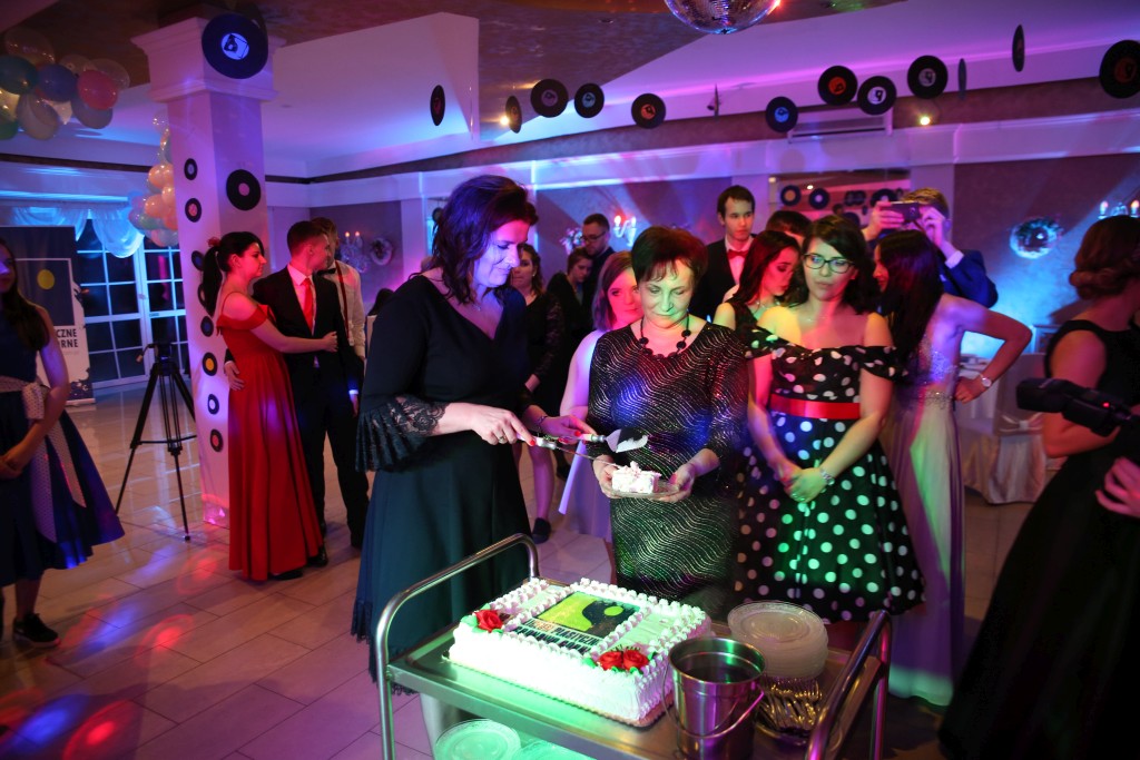 A ta rzeczywiście taka była. Zaraz po reprezentacyjnym polonezie przyszedł czas na mniej oficjalne tańce, toasty i wspólne świętowanie! Wydarzenie uświetnił motyw przewodni – stylizacja na lata 50-te, a także szereg gier i konkursów, w które zostali zaangażowani nauczyciele i pracownicy szkoły.