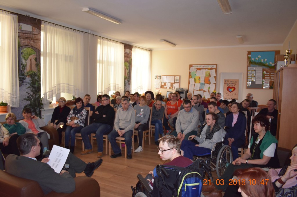 Poezja jest dla każdego – łączy ludzi, wymaga od nas uwagi, otwartości i empatii, pozwala nam zatrzymać się choć na chwilę i uważniej spojrzeć na świat. Spotkanie było wynikiem (zwieńczeniem) konkursu poetyckiego pt. „Wiosna radosna” zorganizowanego przez Środowiskowy Dom Samopomocy w Przezmarku. Byliśmy mile zaskoczeni ilością nadesłanych prac z innych placówek terenu województwa warmińsko – mazurskiego.