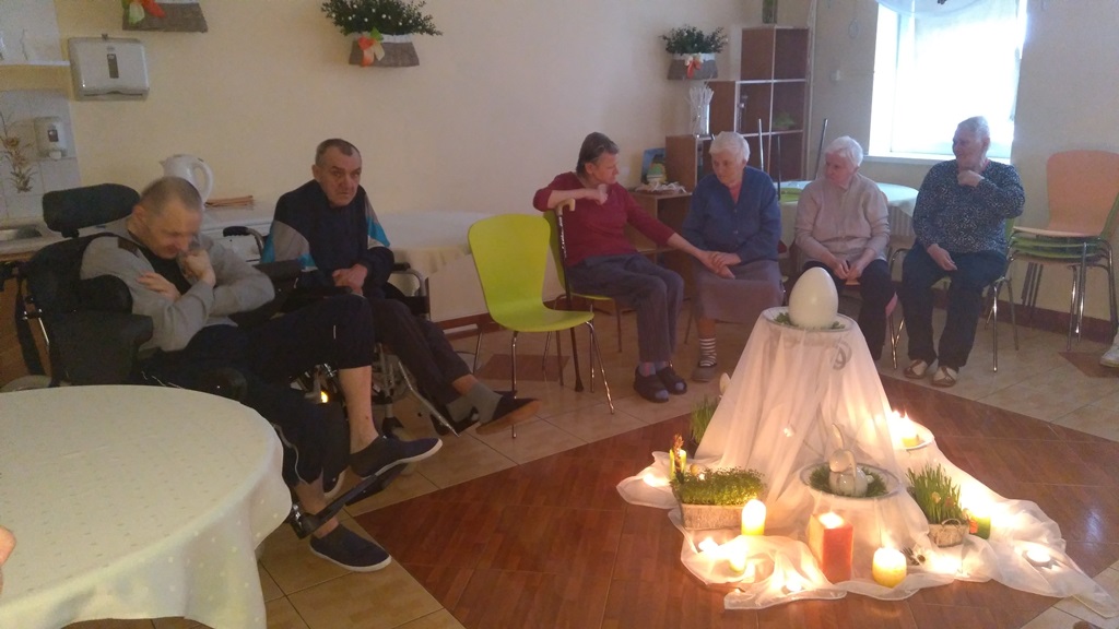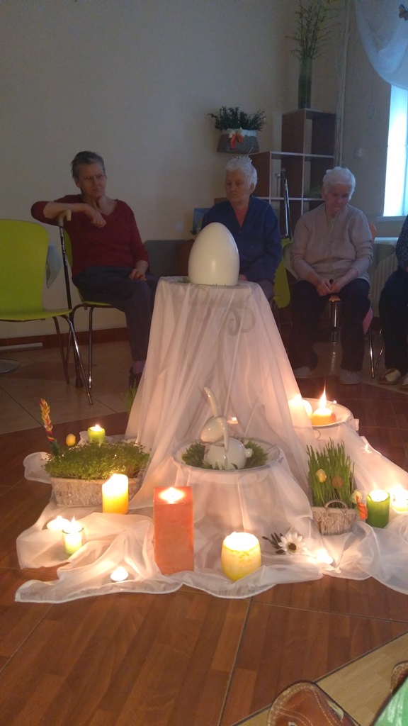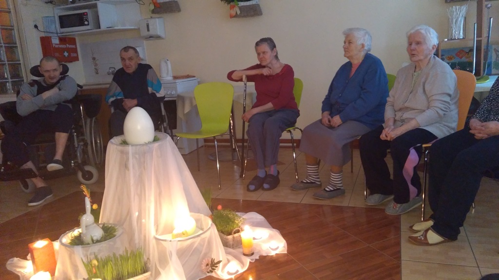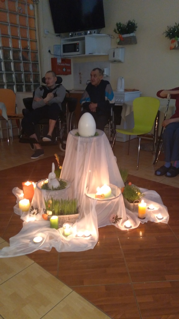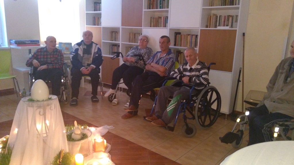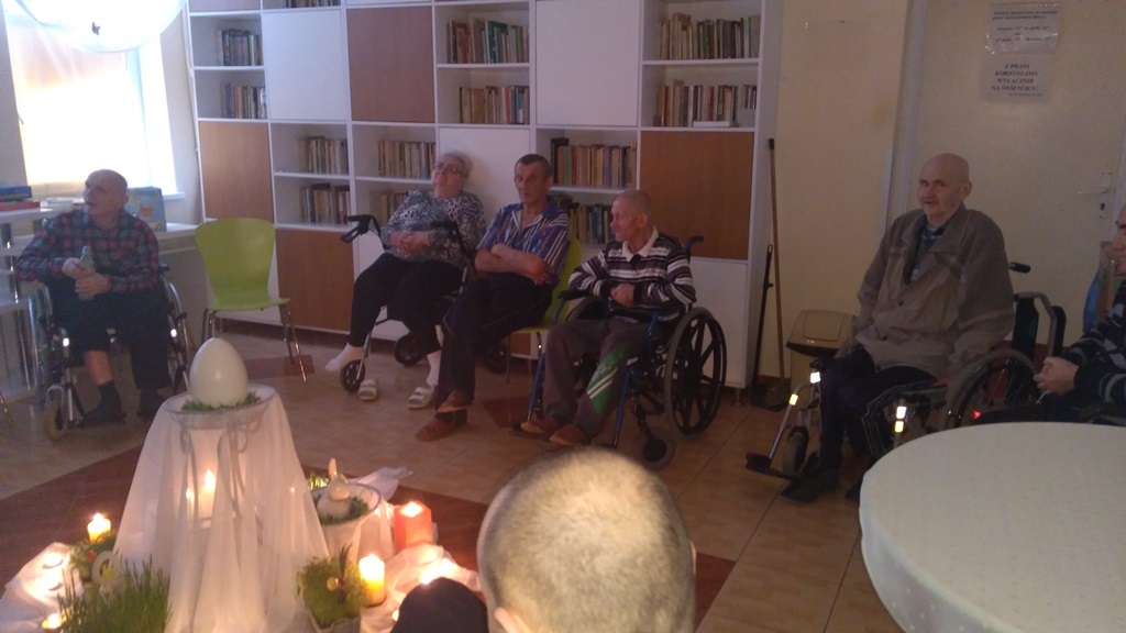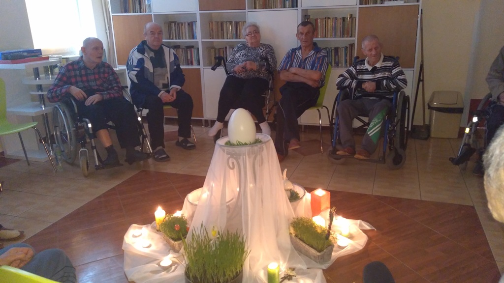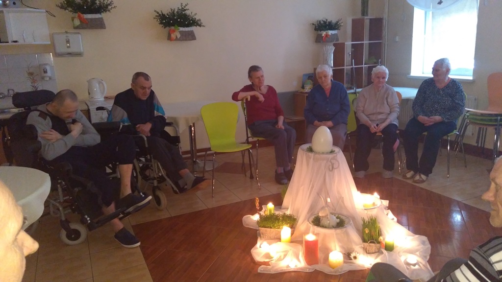 Dnia 28 marca 2018 roku mieszkańcy Domu Pomocy Społecznej w Tolkmicku uczestniczyli w zajęciach wiosenno- wielkanocnych, które odbyły się na świetlicy terapeutycznej. Podczas zajęć wykorzystano elementy muzykoterapii oraz aromaterapii. Uczestnicy zajęć mogli zrelaksować się przy dźwiękach muzyki relaksacyjnej oraz stworzonego na ten czas nastroju. Na zakończenie każdy z mieszkańców mógł się wypowiedzieć na temat tradycji Świąt Wielkanocnych jaki panował w ich rodzinnym domu.