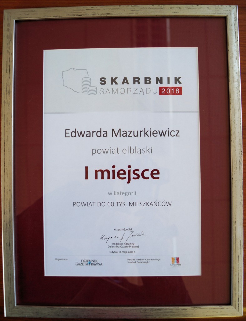 Podczas Kongresu "Perły Samorządu" zorganizowanego w dniach 17-18 maja 2018 r. w Gdyni przez Dziennik Gazeta Prawna, w rankingu "Skarbnik Samorządu 2018", w kategorii powiatów do 60 tys. mieszkańców, Powiat Elbląski znalazł się w gronie zwycięzców poprzez zdobycie zaszczytnego 1. miejsca. Nagrodę odebrała Skarbnik Powiatu Edwarda Mazurkiewicz.