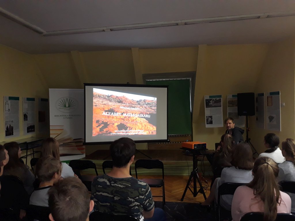 Podczas spotkania podróżnik opowiedział młodzieży o etapach powstawania swojej debiutanckiej książki Miejsce za miejscem, czyli podróże małe i duże, w której umieścił 42 felietony z najbardziej interesujących miejsc na świecie. Słuchacze z ogromnym zainteresowaniem słuchali opowieści o Madagaskarze i jego mieszkańcach, podziwiali na zdjęciach piękno nieskażonej cywilizacją przyrody. Z zaciekawieniem przypatrywali się slajdom ukazującym miasta wyspiarskiego państwa, a w nich życie tubylczej ludności – Malgaszy. Michał Szulim malował słowami widoki pięknych, nieskazitelnie czystych plaż należących do państwa położonego w zachodniej części Oceanu Indyjskiego, charakteryzował klimat ulicznych bazarów, hoteli, restauracji oraz w atrakcyjny i przystępny sposób zaznajomił publiczność z fauną i florą tamtejszych rezerwatów przyrody.