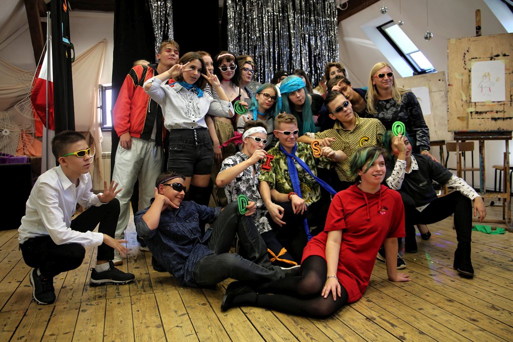 Po zakończeniu części oficjalnej nadszedł czas na otrzęsiny nowych uczniów przygotowane przez klasę drugą. Na moment przenieśliśmy się w klimat Disco lat 90, gdzie królowała ABBA i wiele zespołów, do których utworów tańczymy do dziś. Pierwszoklasiści mieli do wykonania szereg zadań utrzymanych w powyższym klimacie, jak np. przygotowanie charakteryzacji.