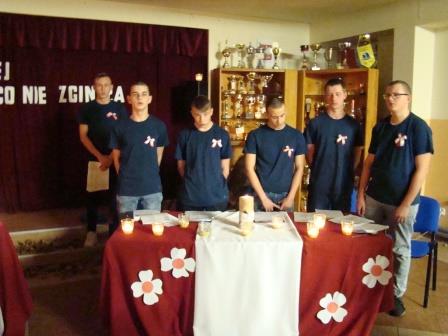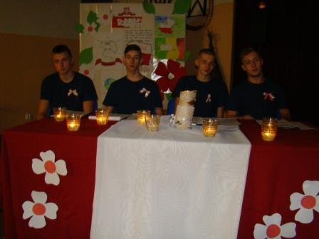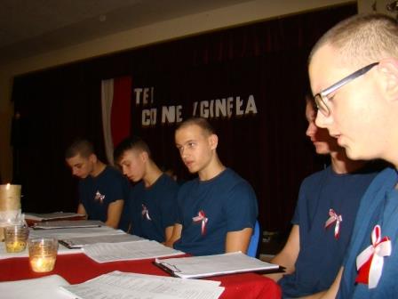 Istotnym elementem wspomnianego wcześniej programu było opracowanie, przygotowanie i zrealizowanie w auli naszego ośrodka w dniu 11 XI 2018 roku przez podopiecznych grupy VI pod kierunkiem nauczyciela historii naszej szkoły mgr Bożeny Szczodrowskiej oraz zespołu wychowawczego grupy VI montażu słowno - muzycznego w postaci UROCZYSTEJ WIECZORNICY z okazji 100 rocznicy odzyskania przez Polskę niepodległości. Spotkanie rozpoczęło się odśpiewaniem przez wszystkich uczestników hymnu państwowego tj. "Mazurka Dąbrowskiego". Następnie nasza młodzież zaprezentowała Dyrekcji placówki, wszystkim pozostałym wychowankom, przybyłym na uroczystość pracownikom ośrodka z rodzinami oraz przedstawicielom rodziców naszych wychowanków - szereg nawiązujących do problematyki niepodległościowej: krótkich szkiców historycznych dotyczących sytuacji społeczno - politycznej na naszych ziemiach u schyłku I wojny światowej, wierszy polskich poetów a przede wszystkim wielu pieśni legionowych.
