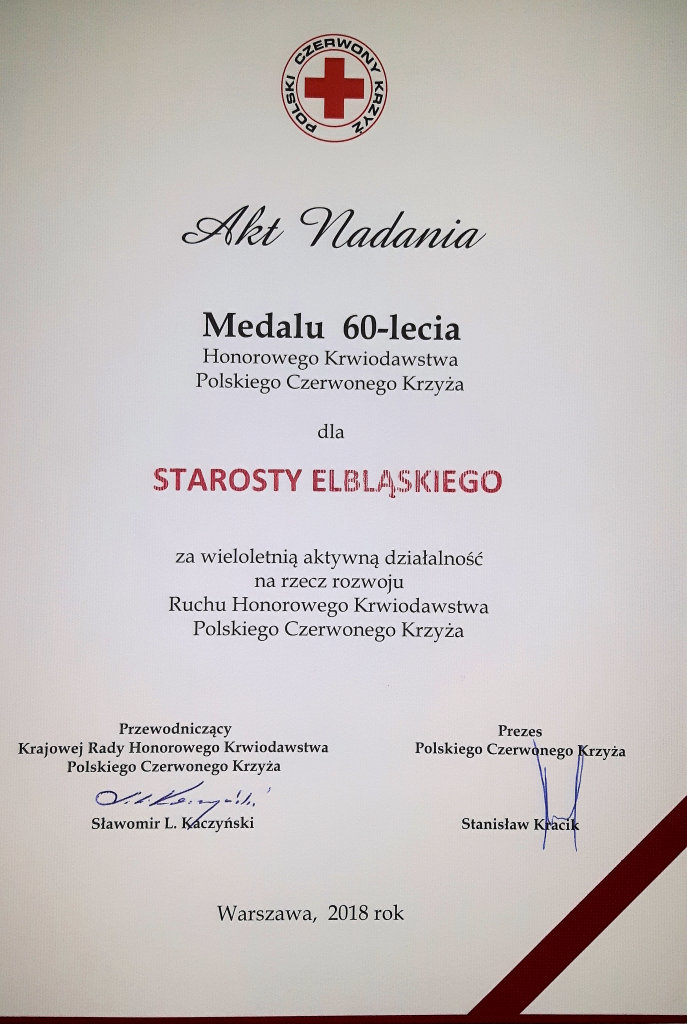 Starosta Elbląski Maciej Romanowski otrzymał medal 60-lecia Honorowego Krwiodawstwa Polskiego Czerwonego Krzyża, za wieloletnią aktywną działalność na rzecz rozwoju tego ruchu.