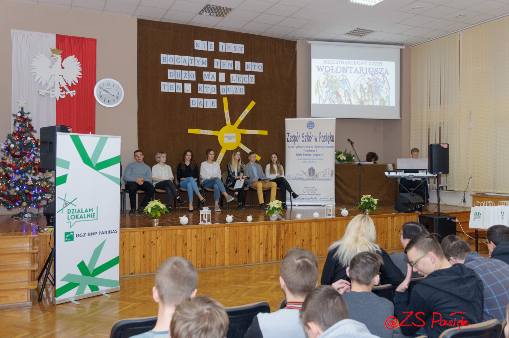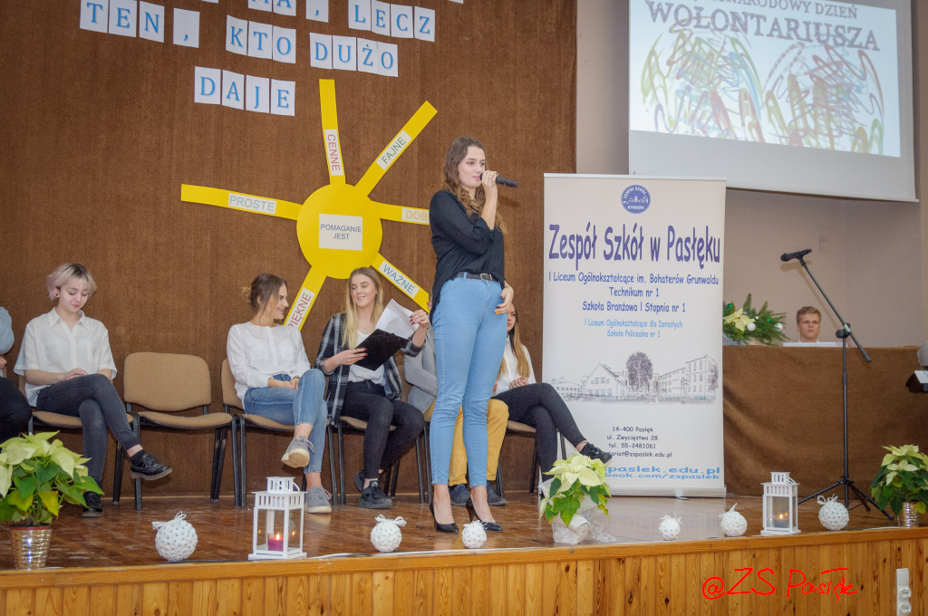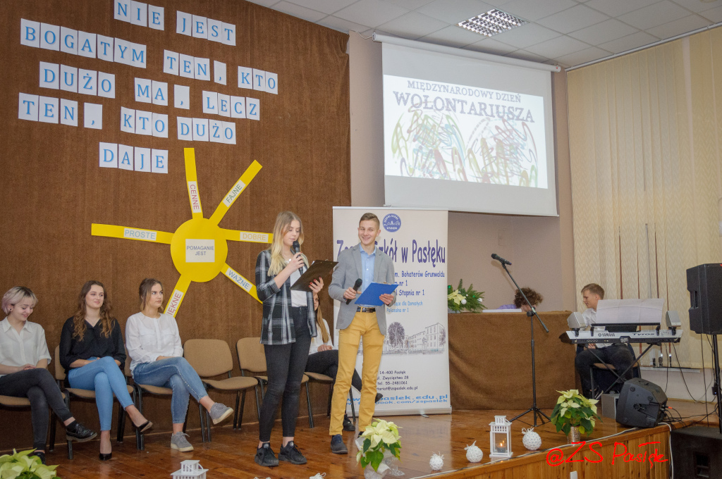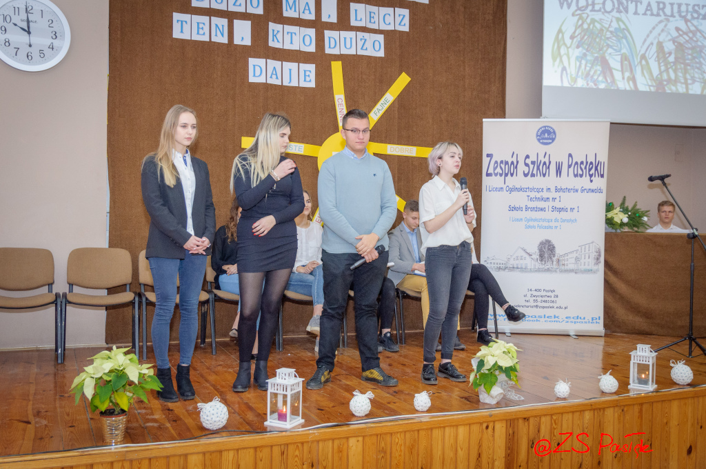 Była to wyjątkowa uroczystość, podczas której wolontariusze przedstawili ideę i historię wolontariatu, a także jakie cechy powinien mieć wolontariusz. Gala została uświetniona występem artystycznym uczniów, którzy zaprezentowali piosenki i wiersze o nieprzemijących wartościach w życiu człowieka, takich jak dobro, wrażliwość czy empatia. Wolontariusze również opowiedzieli o swojej działalności w schronisku „Psi Raj”, Przedszkolu Samorządowym nr 2, Placówce Opiekuńczo-Wychowawczej „Orle gniazdo” w Marwicy oraz w Szpitalu Powiatowym w Pasłęku, a także o różnorodnych akcjach, w których aktywnie uczestniczą.